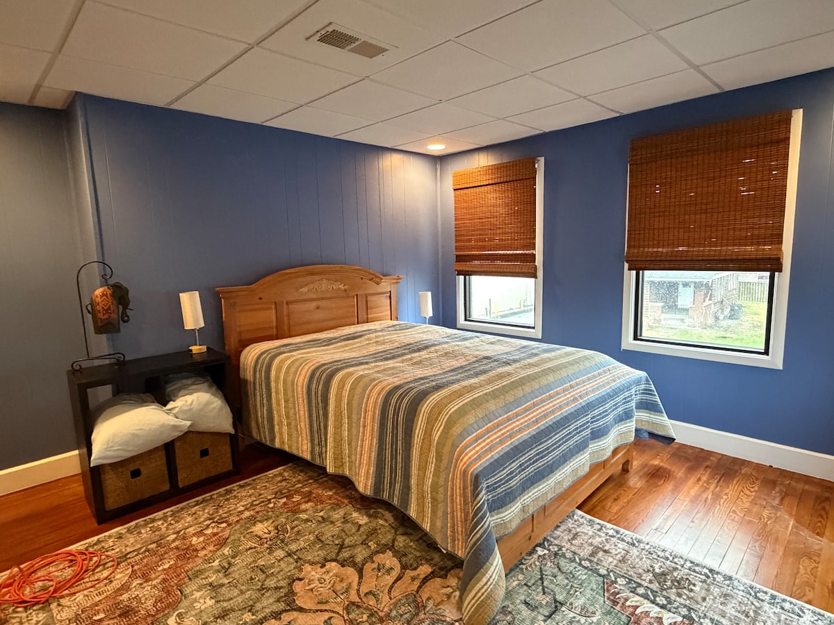 Klifraðu 15 skref að risastórri skógarþilfari og heillandi íbúð með fullbúnu rúmi undir þakgluggum í rólegu samfélagi við ána. Eldhús með örbylgjuofni, hitaplötu, ísskáp, Keurig og convection ofn. Sturtu- og salernisaðstaða flæðir beint að eldhúsi án hurðar svo að þetta rými hentar best fyrir einstakling eða samstarfsaðila sem eru ekki feimnir við að heyra frá baðherbergishljóðum. Og hátt fólk, hafðu í huga: hnéveggir skilja eftir takmarkað höfuðrými báðum megin við loftíbúðina. Ramshackle nágrannar en öruggt hverfi!