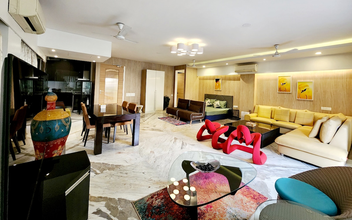 The Terrace Penthouse is completely private, expansive 2500 sqft. of luxurious space, engulfed in greenery, with all modern amenities and creature comforts comparable to a suite. Our location in Lutyens is posh, prime, and super convenient. The neighborhood is extremely safe, manned with guards, and 24/7 security surveillance. The caretaker will help with errands within the premises and is available 7 days a week. For your convenience, there is 1 dedicated parking space within the premises.