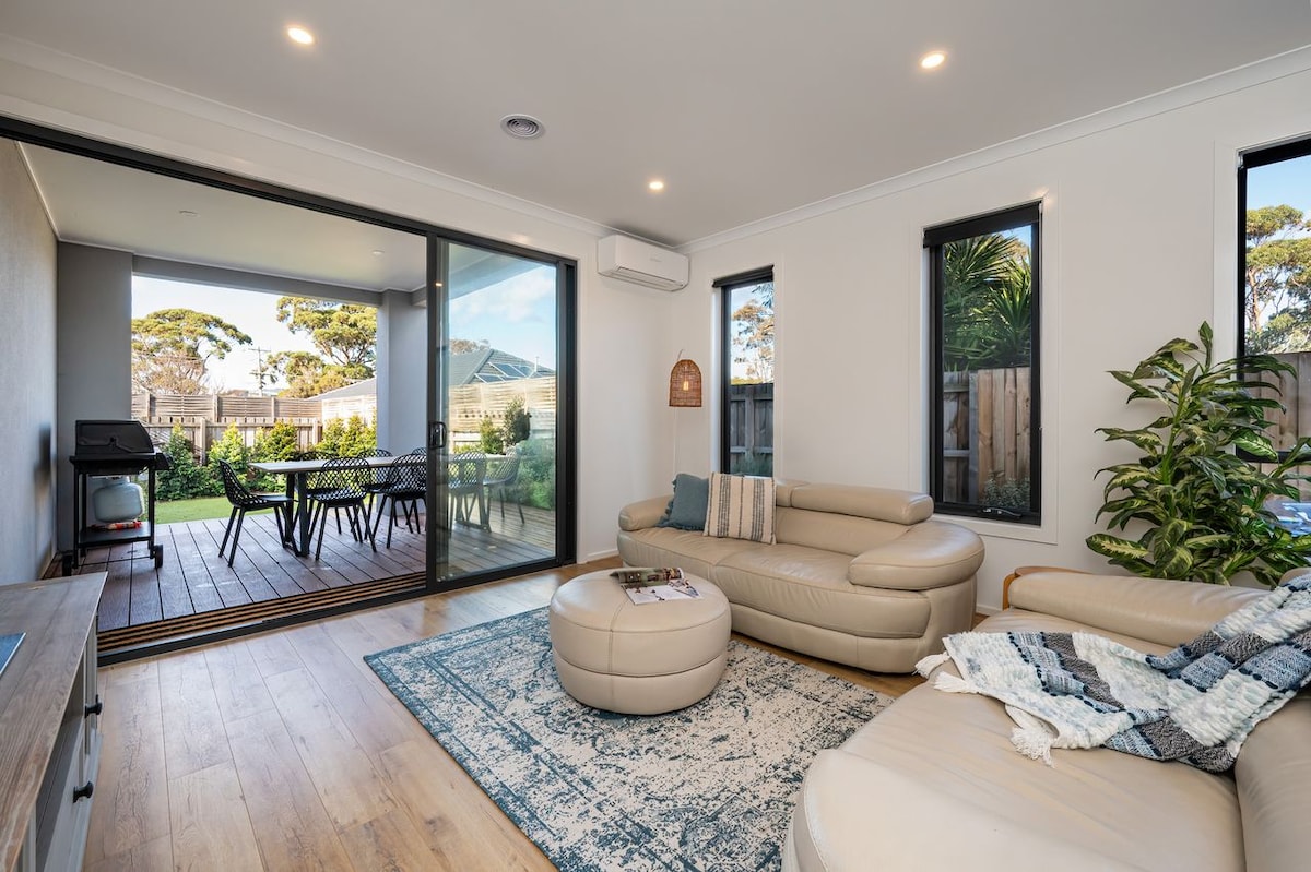 Leave your car 🏎in the driveway! 7 minute walk to the beach🏖 & Cafes & Restaurants 👨🍳🍷 Modern private air conditioned beach house offers 3 bedrms (sleeps7)2 bathrooms, big living area, and well appointed kitchen. Fireplace 🔥 Dishwasher 🍽 Coffee Machine ☕️ Backyard Al fresco dining 🥂 Wifi 👨💻 Aircon Come and enjoy the house, beach and cafes Max 7 guests min 2 nights during normal times & holiday periods vary. Linen and towels NOT provided Please note check in time for 31 Jan is 3pm
