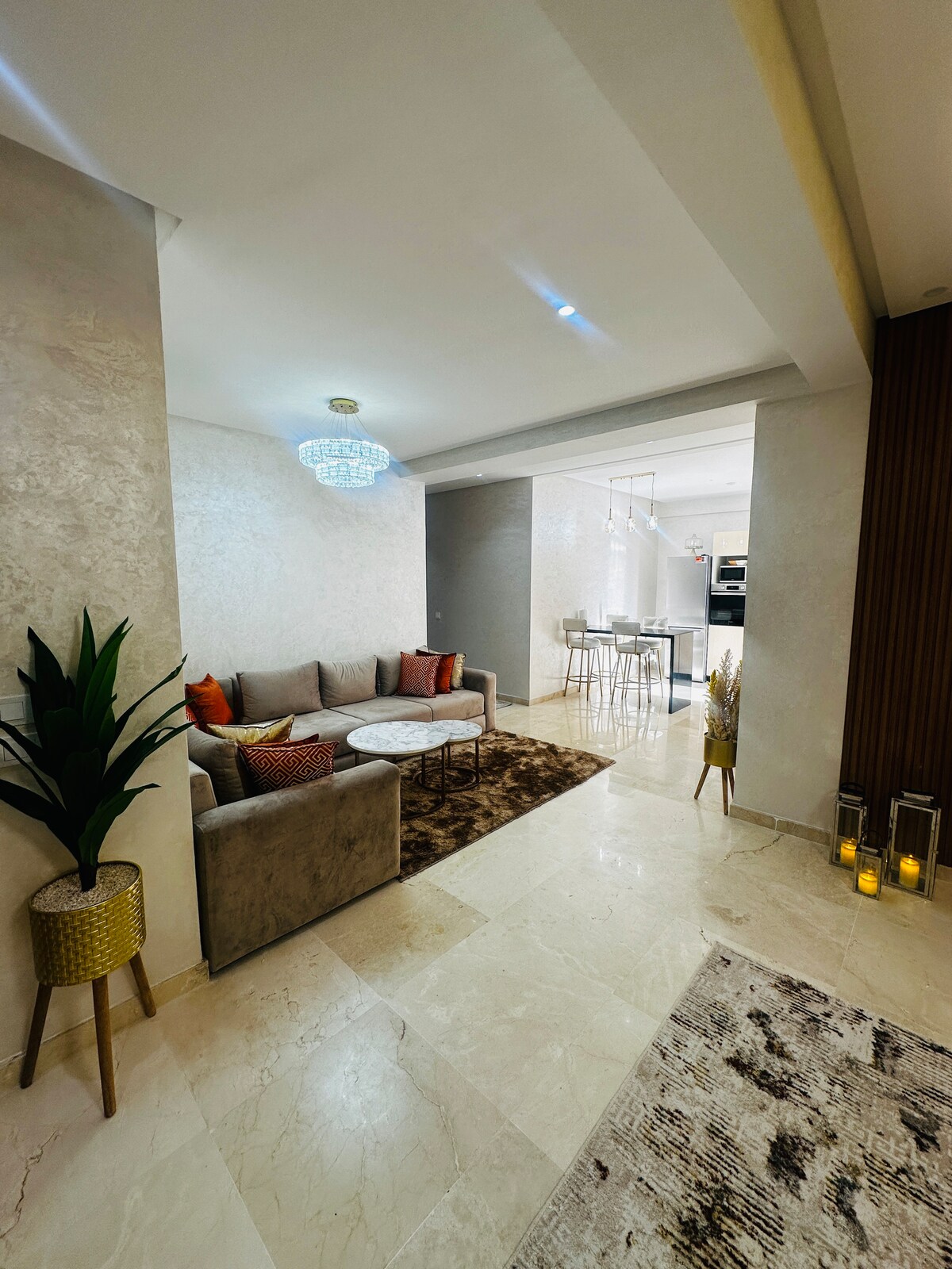 Offrez-vous un séjour reposant dans ce bel appartement climatisé, idéalement situé dans un quartier calme et sécurisé, à moins de 10 minutes de la plage. Vous serez à proximité immédiate des commerces : Marjane et Carrefour, de nombreux restaurants, salles de sport, spa et hammam également disponibles à quelques minute.Situé au 4ᵉ étage avec ascenseur, l’appartement offre une vue dégagée et un grand confort. Profitez d’un espace moderne avec tout le nécessaire pour un séjour agréable wifi fibre