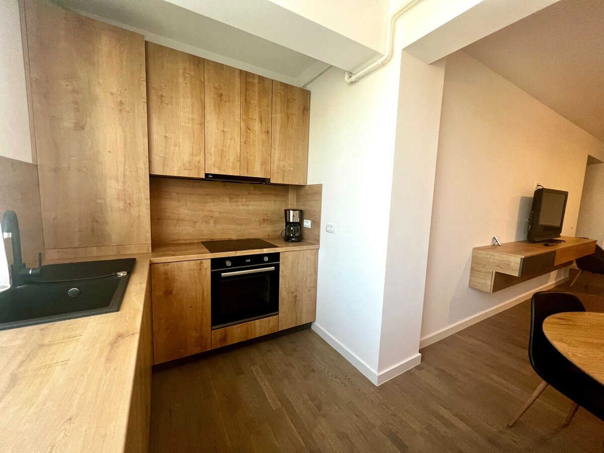 Íbúðin er hluti af nýrri byggingu, byggðri árið 2025, með 2 herbergjum með tveimur hjónarúmum og svefnsófa í stofunni. Í eldhúsinu er allt sem þarf til að útbúa máltíð og þú getur sest við borðið innandyra sem og við borðið á svölunum til að njóta draumkennds útsýnis. Frá svölunum sést allt ímyndaða þorpið, þar sem íbúðin er á efri hæðinni. Staðurinn er í 5 mínútna fjarlægð frá borginni Suceava (miðborg, virki) sem tryggir rólega og skilvirka gistingu.