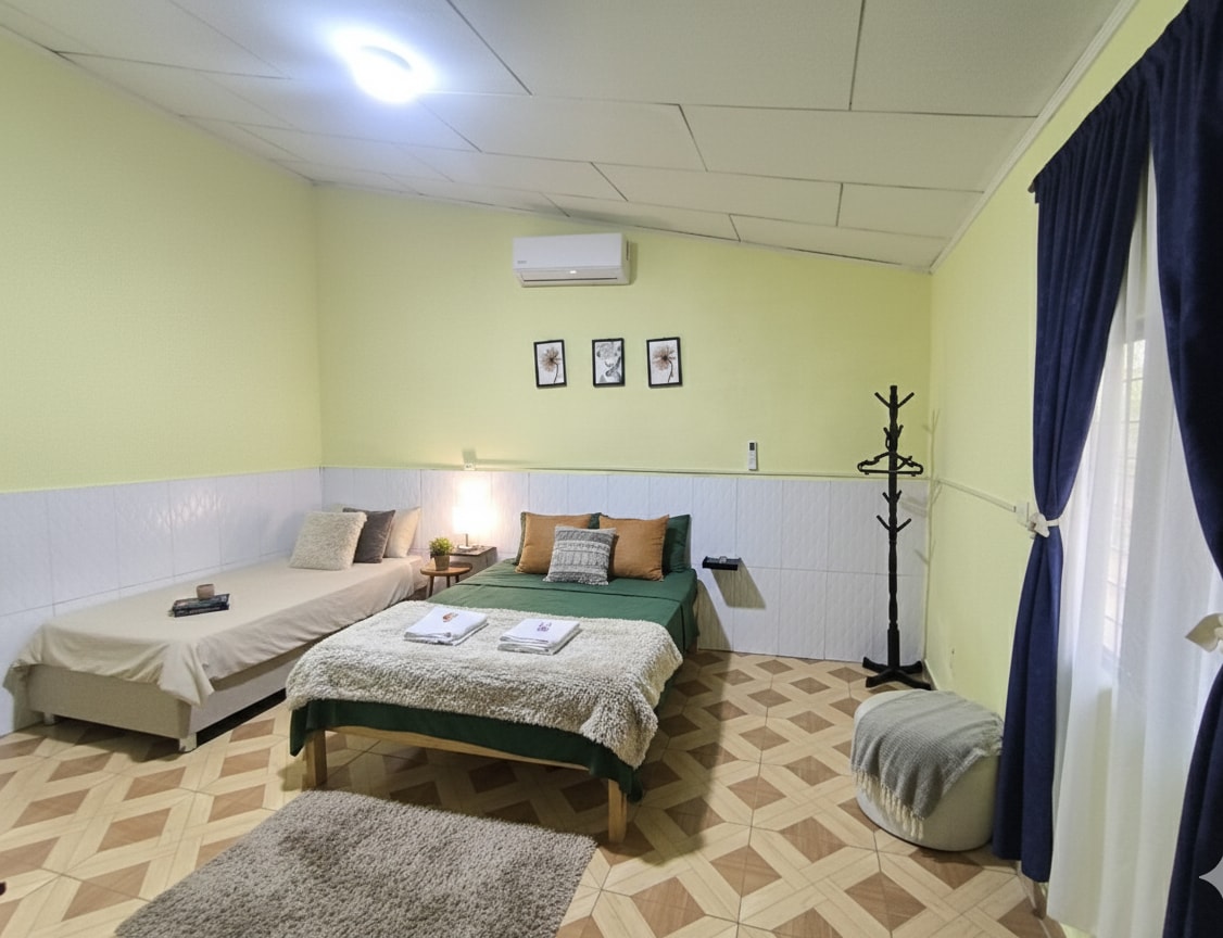 Tveggja svefnherbergja íbúð á annarri hæð. 1. Í fyrsta svefnherberginu er loftkæling, tveggja sæta rúm, snjallsjónvarp, fataskápur og nammi. 2. Annað svefnherbergið er með viftu, eitt og hálft rúm, kofa eða koju og snjallsjónvarp. Fullbúin borðstofa sem er tilvalin til að útbúa matinn. 3. Sameign (sundlaug, þvottahús/verönd).