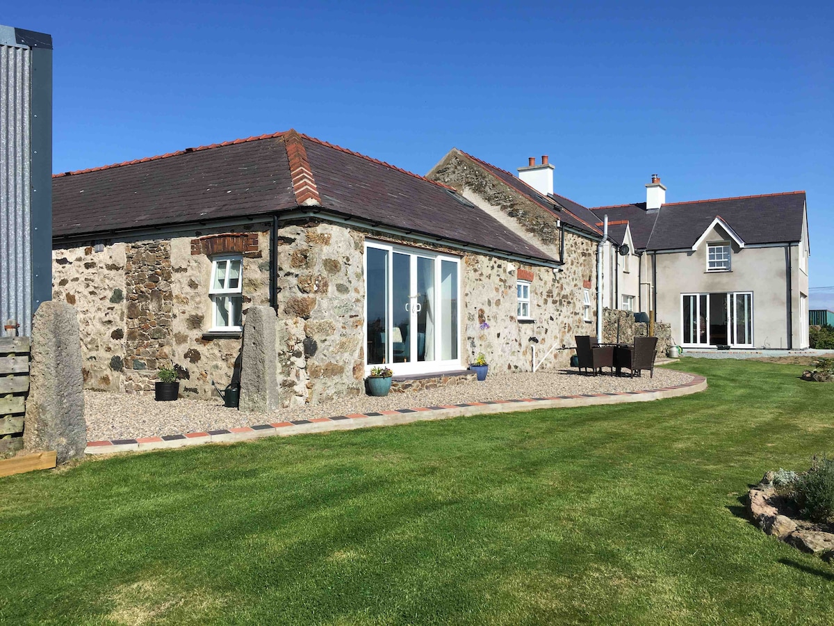 Töfrandi hlöðubreyting á „svæði með framúrskarandi náttúrufegurð“ með glæsilegu sjávarútsýni frá setustofunni og veröndinni. Staðsett á litlum holding innan 8 hektara af opinni sveit, 1 mílu frá ströndinni. Tilvalið fyrir gesti sem njóta opinnar sveitar, strandstíga, dýralífs, fugla og stranda, töfrandi útsýni, frið og ró. Golf, hjólreiðar og veiðar eru einnig í boði í og í kringum Church Bay/ Llanrhyddlad. Rúmar 6 í King eða Single rúmum.