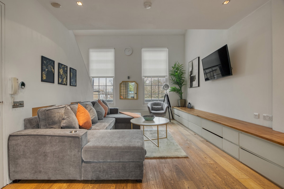 Slappaðu af í notalegu og nútímalegu umhverfi á fyrstu hæð sem hefur nýlega verið endurnýjað og endurnýjað til fullkomnunar. Mjög friðsælt en í 3 mínútna fjarlægð frá hjarta Angel. Íbúðin okkar er með mjög stórt king-size rúm og þægilegan svefnsófa í stofunni fyrir þá sem ferðast með vinum eða fjölskyldu. Við höfum hugsað um hvert smáatriði til að gera dvöl þína virkilega ánægjulega. Njóttu þess að eiga þitt annað heimili í miðborg London!