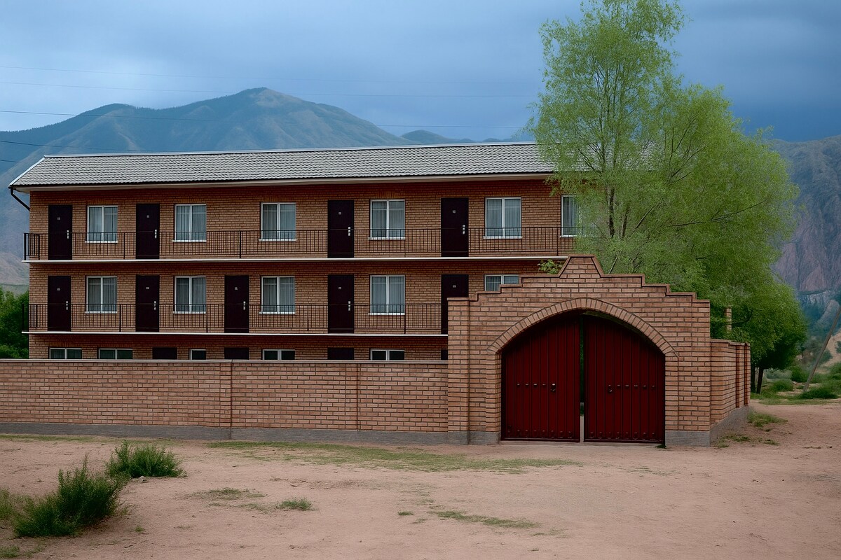 NÝTT gestahús í þjóðernisstíl, kristaltæru lofti og ótrúlegu andrúmslofti - fullkomið afdrep í Kirgistan! Á fyrstu hæðinni er stór stofa þar sem hægt er að slaka á og eldhús með öllum þægindum og tækjum. Á annarri hæð eru 3 svefnherbergi, hvert með 3 rúmum. Í hverju svefnherbergi í gestahúsinu er salerni, vaskur og sturta. Við erum að stunda búskap. Það er fallegur garður með 4 pöllum við ána og 5 hengirúmum komið fyrir.