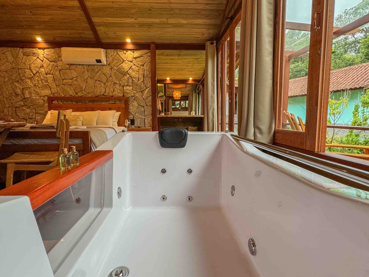 O Chalé Ofurô fica na ilha da propriedade. Conforto, aconchego e charme, é perfeito para relaxar e curtir momentos incríveis a dois. Possui uma varanda com rede de frente para o rio. Um silêncio que convida a uma boa leitura e garante uma maravilhosa noite de sono. Chalé romântico para momentos de relaxamento. Sauna e banhos de cachoeira.