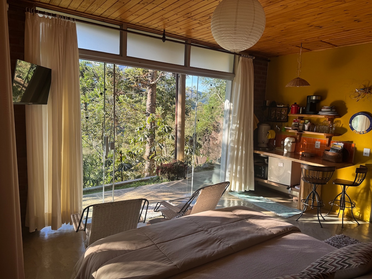 Moramos por 7 anos nesse refúgio exclusivo no meio de montanhas e cachoeiras. Construímos esse lugar pensando em todos os detalhes para viver bem. Agora abrimos as portas para pessoas que desejem ter essa experiência de tranquilidade e conforto. Sala com lareira, cama king size com lençóis macios num quarto com varanda - com vista para as montanhas e cachoeira, cozinha maravilhosamente equipada, inclusive com um fogão a lenha belíssimo. Localizada a 20km da cidade de Itamonte 4h de SP ou RJ.