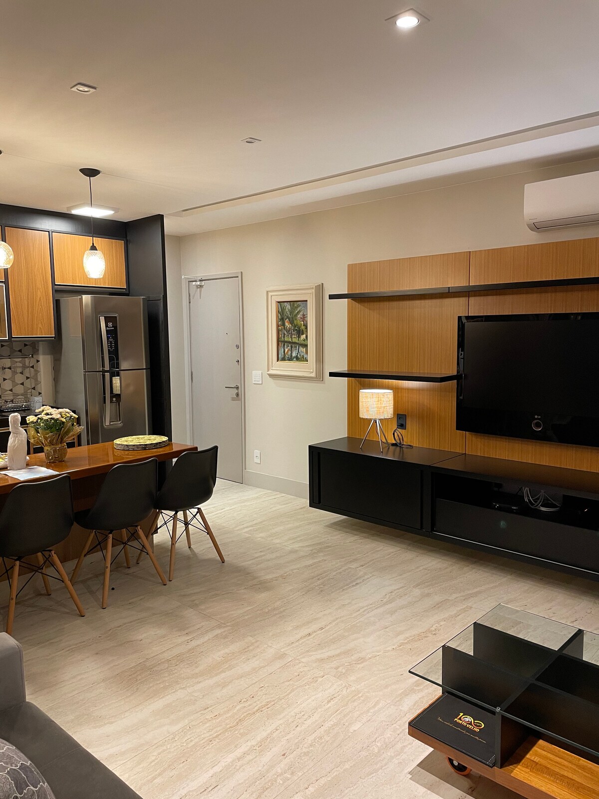 Amplo sala e quarto com varanda, decorado e totalmente equipado: Internet de alta velocidade, Wi-Fi, 2 smart tv's , sala com ventilador de teto e sofá cama, quarto com cama de casal e ar condicionado split, agradavel espaço/escritorio com impressora, cozinha americana com geladeira,fogão, micro ondas, torradeira, liquidificador, máquina de café Nespresso e utensílios,secador de cabelos,máquina de lavar roupas,ferro e tabua de passar roupas,charmosa varanda com vista lateral da praia e piscina.