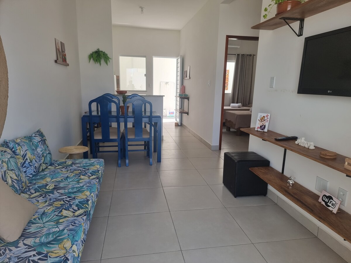 Hið glænýja og heillandi Kitnet með allt á einum stað. Eldhús með öllu sem þú þarft. Vordýna, lyktandi rúmföt, sæt handklæði og þægindi Apart-hótels. Útisvæði með skyggni frá mangótré til að slaka á í hengirúmi. Gestgjafi fyrir tvo einstaklinga. Við biðjum gesti um að ljúka skráningu á verkvanginum og senda okkur gögn um alla gesti sem koma til að gista í húsinu til að tryggja öryggi allra.