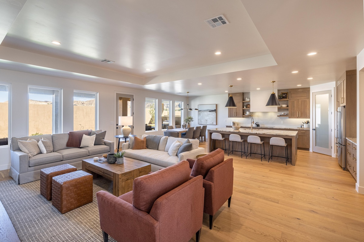 Farðu í afslappandi frí í nýja lúxusheimilinu okkar sem er staðsett í Snow Canyon State Park í þessu einstaka hverfi bak við Encanto Resort. Njóttu kyrrðarinnar í fjöllunum í kring, slakaðu á í heilsulindinni eða upphituðu sundlauginni með útsýni yfir rauðan klettinn eða slakaðu á og fáðu þér vínglas við eldinn á meðan þú nýtur friðsældarinnar í bakgarðinum við fossinn. Þú ert aðeins í nokkurra mínútna fjarlægð frá Black Desert Golf Resort, gönguferðum, hjólum, Red Mountain Spa og Tuacahn hringleikahúsinu.