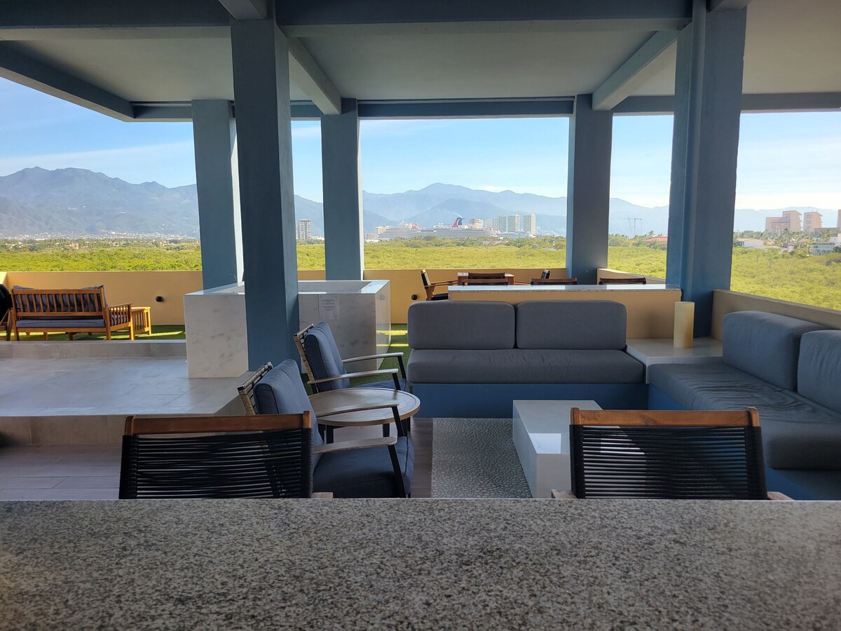 Welcome home to your MODERN 7th FL condo. Your Rooftop infinity pool w/ a BREATH-TAKING VIEW of the sea and cruise ships: simply stunning! Our space offers all the convenient amenities. Rooftop BBQ or gym with a view? You got it! All in a perfect location; only a 12-min walk to the beach, restaurants, bars, groceries, malls, cinema, and hospital. The Malecón, Romantica, and Marina are a quick 10-min drive away! YOUR dream getaway with stunning rooftop views right here in beautiful PV.