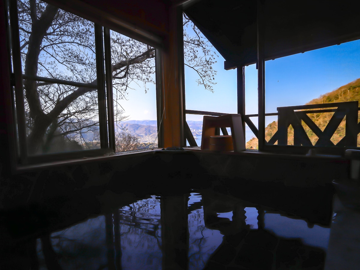 干物が有名な南熱海・網代の町から、少し険しい山道を登った先の高台に佇むモダンな一軒家。 中に入ると木の香りに包まれます。 幅約10メートルの窓から広がる景色は息をのむ素晴らしさ。ブラインドが上がる時の感動を体験してください。熱海の夜景や花火も存分にお楽しみいただけます。晴れた日は屋上からも最高の景色と星空が眺められ、BBQも楽しめます。 お風呂は網代温泉の源泉で、二人で入れるゆったりした陶器風呂。高温のカルシウム・ナトリウムー塩化物温泉は体の芯から温まりお肌もつるつるに。 1階は寛げる寝室。布団のご用意もあるのでお子様にも安心です。壁掛けテレビとデスクがあります。 大型スクリーンに短焦点プロジェクター・WiFi等も揃っておりワーケーションにも最適!映画鑑賞やゲーム機持参で大画面でのゲーム大会もお勧めです。 広いキッチンに調理家電や洗濯乾燥機も完備で、長期滞在でも困りません。 小さなお子様用の絵本やベビーバスベビーチェアもございます。 海を眺めてのんびりしても、熱海や伊豆の観光拠点にも。どうぞ思い思いにお過ごしください。 ⭐︎チェックアウト日のタクシー手配可