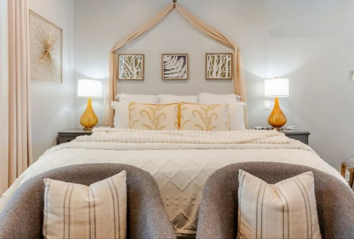 Eignin er glæný, rúmgóð, einstök og full af nútímalegum stíl. Þetta er gistihús í bakgarði með 1 svefnherbergi í king-stærð, eldhúskrók, 1 baðherbergi og þvottahús. Við erum 6 mínútur frá miðbæ Aþenu og Stadium. **Þessi eign ER EKKI MEÐ ELDAVÉL** Hún er með rafmagnsgrind til að útbúa morgunverð, Air Fryer/Rotisserie og örbylgjuofn. Einnig er til staðar ísskápur og vaskur í fullri stærð. Myndir gera það ekki fyrir réttlætið. Við erum með dyrabjöllu og myndavélar fyrir utan sem fylgjast með fram- og bakgarðinum.
