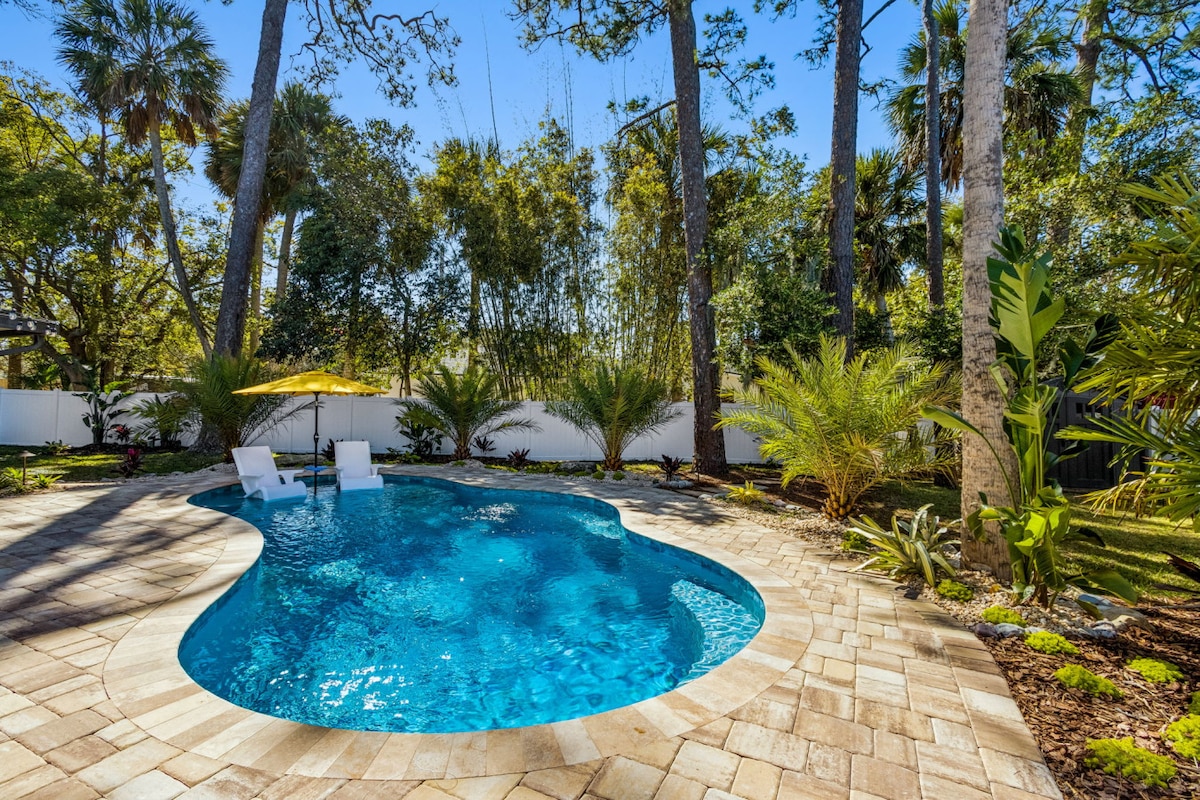 Þetta rúmgóða hús er með fallega einkasundlaug og sólstóla til að slaka á við laugina. Fullkomið fyrir samkomur með vinum og fjölskyldu ásamt risastórum bakgarði með litlu blak leiksvæði. ***Allt rýmið, þar á meðal sundlaug og risastór bakgarður með eldstæði og grill, er einkarými fyrir þig*** 6 húsaraðir frá ströndinni 1 mín. akstur á ströndina 5 mín. göngufjarlægð frá ströndinni 14 mín. akstur að Tournament Players Club: Golfverslun