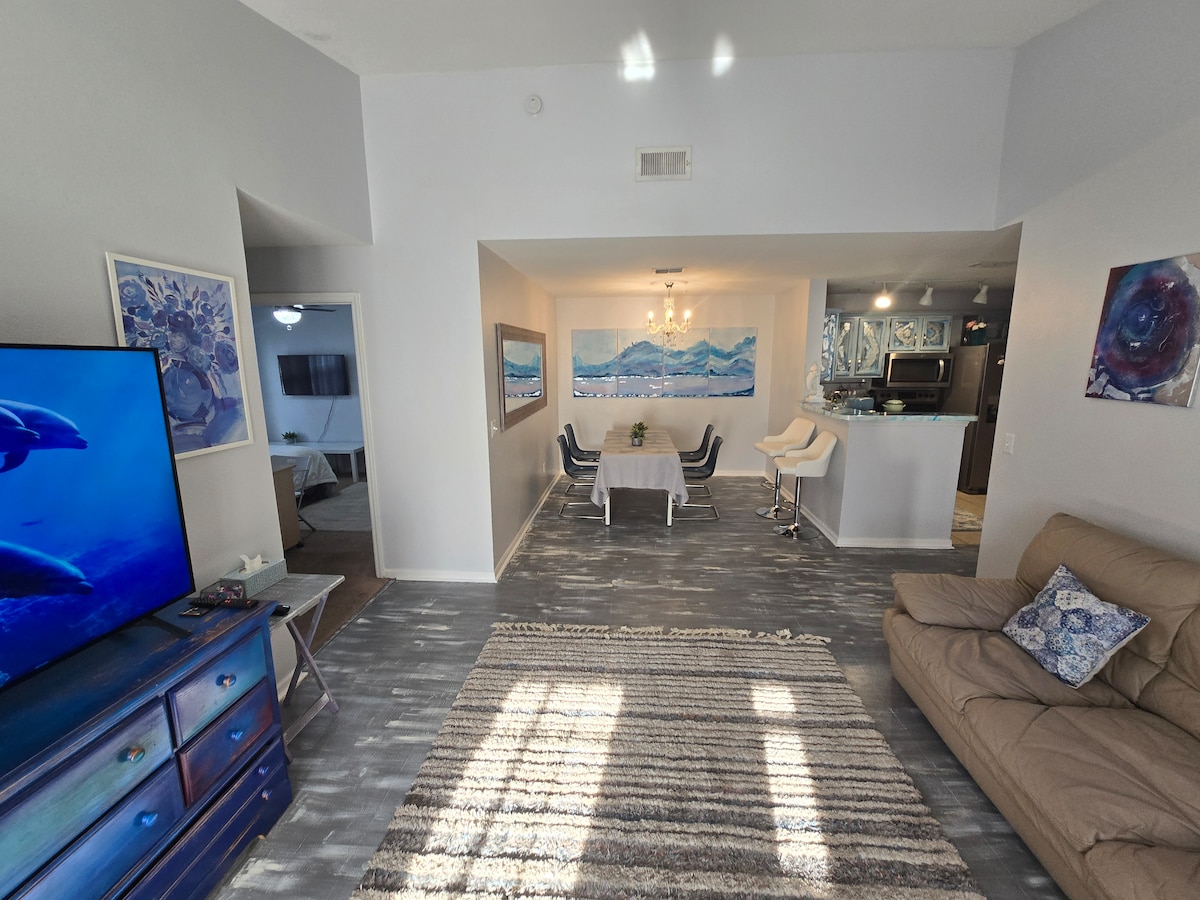 Ertu að leita að fullkomnu strandferðalagi? Horfðu ekki lengra en töfrandi 1 rúm íbúð okkar staðsett á ströndinni í sólríka Jacksonville. Með stórkostlegu sjávarútsýni frá einkasvölum þínum líður þér eins og þú búir í paradís frá því að þú kemur á staðinn. Íbúðin okkar er fullbúin húsgögnum og búin öllum þeim þægindum sem þú þarft fyrir þægilega dvöl. Slakaðu á við glitrandi sundlaugina, farðu á ströndina, við hliðina á almenningsgörðum, verslunum og njóttu margra veitingastaða - allt í göngufæri!