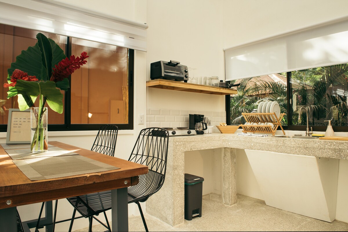 Farðu á næsta stig í fríinu með þessu vel skipulögðu og fullkomlega staðsetta íbúðarhúsnæði í hjarta Jaco Beach! Þessi íbúð er í aðeins 50 metra fjarlægð frá ströndinni og í 50 metra fjarlægð frá miðbænum. Hún býður upp á allt sem þú þarft fyrir besta fríið. Með queen-rúmi, fullbúnu baðherbergi með heitu vatni, eldhúskrók með ísskáp og örbylgjuofni, hágæða borðstofuborði, sjónvarpi með betri kapalsjónvarpi, hröðu þráðlausu neti og ótrúlegu starfsfólki á staðnum sem aðstoðar þig við allar þarfir þínar.