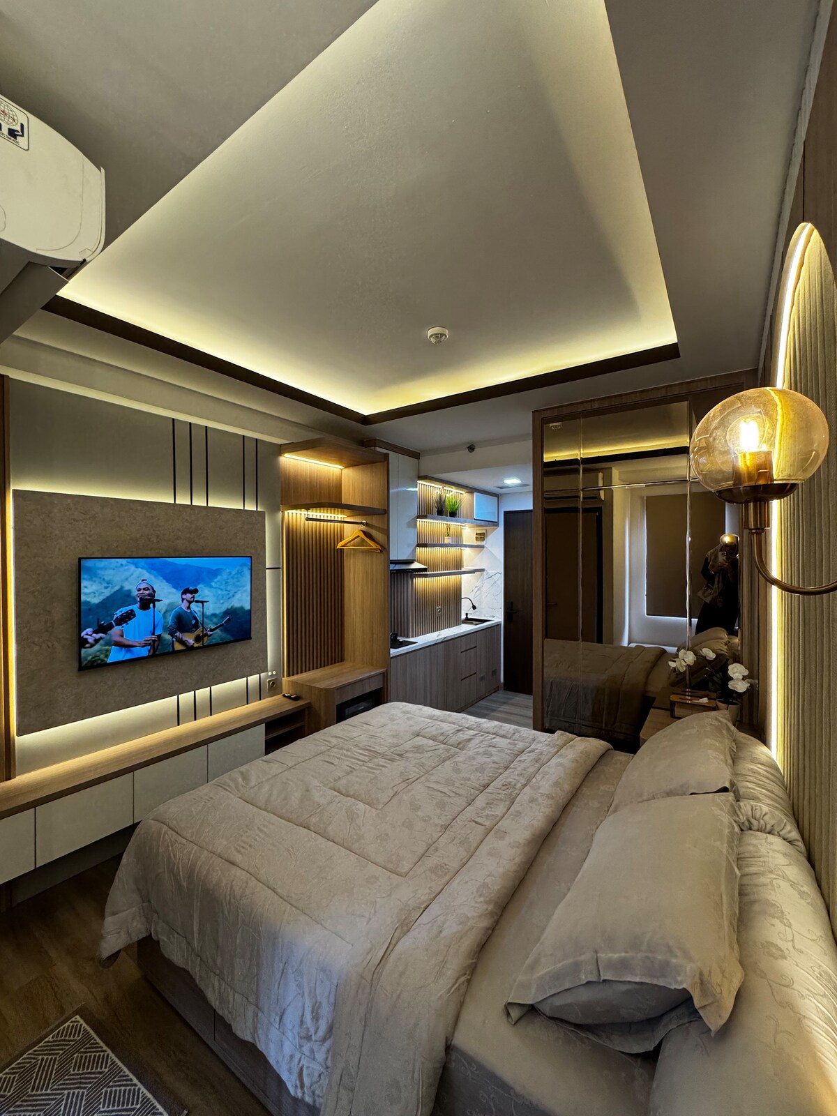 Komdu þér fyrir í friðsælum vin þar sem hreinar línur, náttúruleg efni og samfelld litapalletta skapa kyrrð. Þetta haganlega hannaða Airbnb er griðastaður einfaldleika og virkni og býður upp á friðsælan flótta frá ys og þys borgarinnar. Með beinan aðgang að Central Park Mall ertu í aðeins nokkurra skrefa fjarlægð frá heimi verslana, veitingastaða og afþreyingar. Hvort sem þú ert í stuði fyrir verslunarferð eða farðu í göngutúr í Jakarta Aquarium, þá er allt fyrir dyrum.
