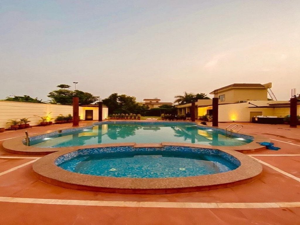 Einka-bændagistihús með sundlaug og grænu grasflöt, Punjab