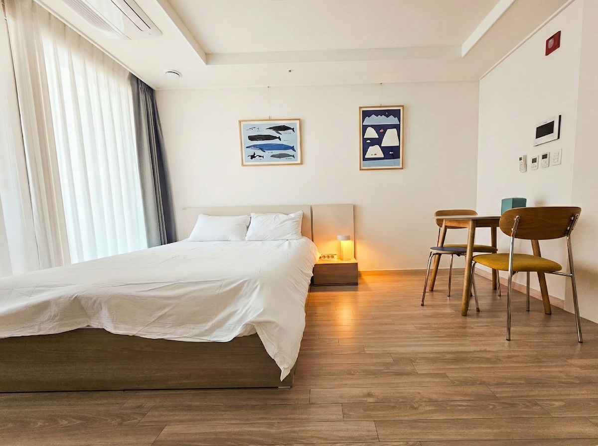 🏙 [Um staðsetningu og umhverfi eignarinnar] Hún er staðsett í miðborg Sokcho og því er þægilegt að ferðast og þú getur notið helstu veitingastaða og kennileita fótgangandi. Fullbúið eldhúsáhöldum, þvottavél er til staðar og rúmar allt að 4 manns, með sjávarútsýni og aðgang að sjó, miðlægum markaði, Abai-þorpi og Youth Mall í göngufæri. 🧺 [Hreinlæti og hreinlæti] Öll rúmföt og handklæði eru þvegin daglega og skipt út fyrir háhitasóttarþurrkun. Við bjóðum upp á hreint og notalegt rúmföt í hótelstíl og ánægjulegt umhverfi. 🔍 [Þægindi] Nauðsynleg tæki og eldhúsáhöld eins og kaffipottur, örbylgjuofn, þvottavél, ísskápur o.s.frv. eru til staðar fyrir einfaldar máltíðir og þvott. Á 1. hæð er E-Mart 24 (07:00-24:00) þjónustubúð, sjálfsþvottastöð, Yechon Seolleongtang og Mexicana Chicken. Það er skjábolfvöllur og nuddstofa á annarri hæð til að auðvelda notkun. 👩💼 [Leiðbeiningar gestgjafa] Á Sunrise Hotel, vandlega útbúið af Jini Njóttu afslappandi og sérstaks dags í miðborginni.