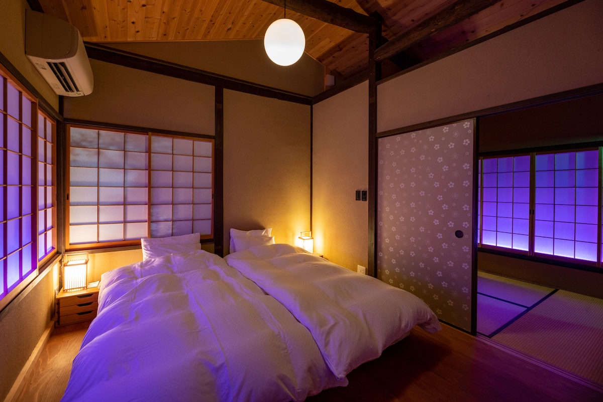 ┏━━━━━━━━━━━━━━━━━━━━━━━━━┓ ◆ Takmarkað við einn hóp á dag/einka ~ dvöl í ryokan- og vöruhúsaupplifunarstíl ◆ ┗━━━━━━━━━━━━━━━━━━━━━━━━━┛ ■ Staðsetning, saga, eiginleikar ■ Þessi sögulegi ryokan-gististaður (áður Kawanaga Ryokan) er staðsettur í Mitsuhama, hafnarþorpi í Matsuyama/Dōgo, og er 106 ára gamall og umkringdur fjórum jarðgeymslum með hvítum veggjum sem byggðar voru á Edo-tímabilinu og fjórum görðum. Ryokan-hótelið hefur smám saman verið endurnýjað og endurvakið (það er í endurnýjun núna) og er meðal annars með hvítmáluðum jarðvegsveggjum og náttúrulegri Kenji-zeki bambusgirðingu.Upphaflega var þetta gamalt hús sem opnaði starfsemi sem gistiaðstaða sem þjónar nánast eingöngu innlendum gestum.Við erum að setja upp hálfopið útibað inni í vöruhúsinu og endurbætur snúast að vatninu. ■ Róandi garður með mosablæ ■ Hér eru framslóðir, húsagarðar, bakgarðar og þrír mosagarðar og vatn frá brunninum rennur alls staðar. Hér eru einnig handvatnsskálar, straumar, dádýr, lækir sem renna á milli fljúgandi steina og tjarnir í pottum, þar á meðal með koi-, medaka-, tanago- og ánarækju, sem og lífrænt svæði þar sem villtir fuglar búa. ■ Chick-in-setustofa (kaffihús/bar), minjagripa horn ■ Þú getur drukkið ekta kokkteila á fyrstu hæð aðalbyggingarinnar.Það eru minjagriparkrókar með ýmsum innanhússvörum sem fluttar eru inn frá erlendis, fylgihlutum, náttúrusteinum og verndargröfum, til dæmis frá Balí.