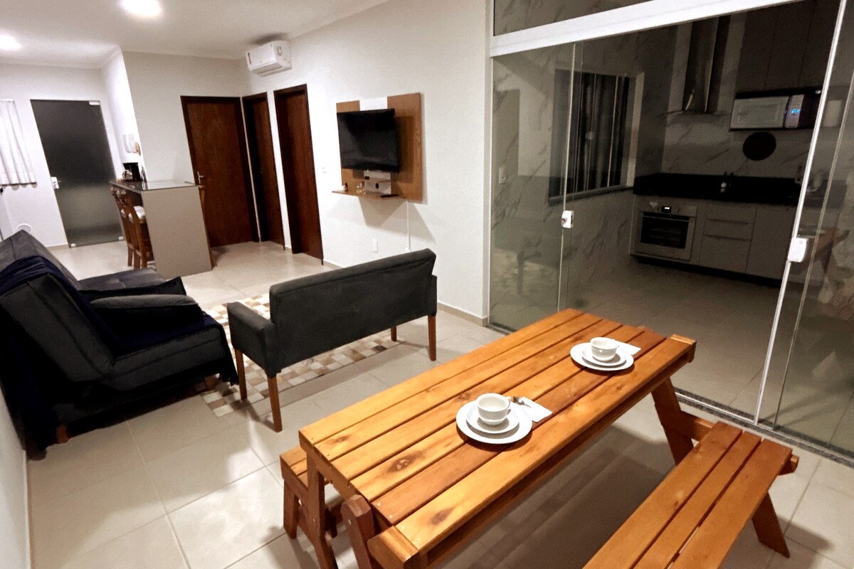 Kynnstu þægindunum og þægindunum í nútímalega, flata tvíbýlishúsinu okkar sem er aðeins nokkrum metrum frá hjarta borgarinnar. Gistingin okkar er fullkomin fyrir viðskiptaferðamenn eða ferðamenn í frístundum og býður upp á fágað og hagnýtt umhverfi sem hentar vel fyrir eftirminnilega dvöl. - Svíta: Queen-rúm, fataskápur og skrifborð. Baðherbergi með vatnsnuddi; - Sala: Með sófa og 50"snjallsjónvarpi; - Fullbúið eldhús: Með ísskáp, rafmagnseldavél og örbylgjuofni; - Baðherbergi - Air 24.000 BTUs; - Miðlæg gashitun; - þráðlaust net