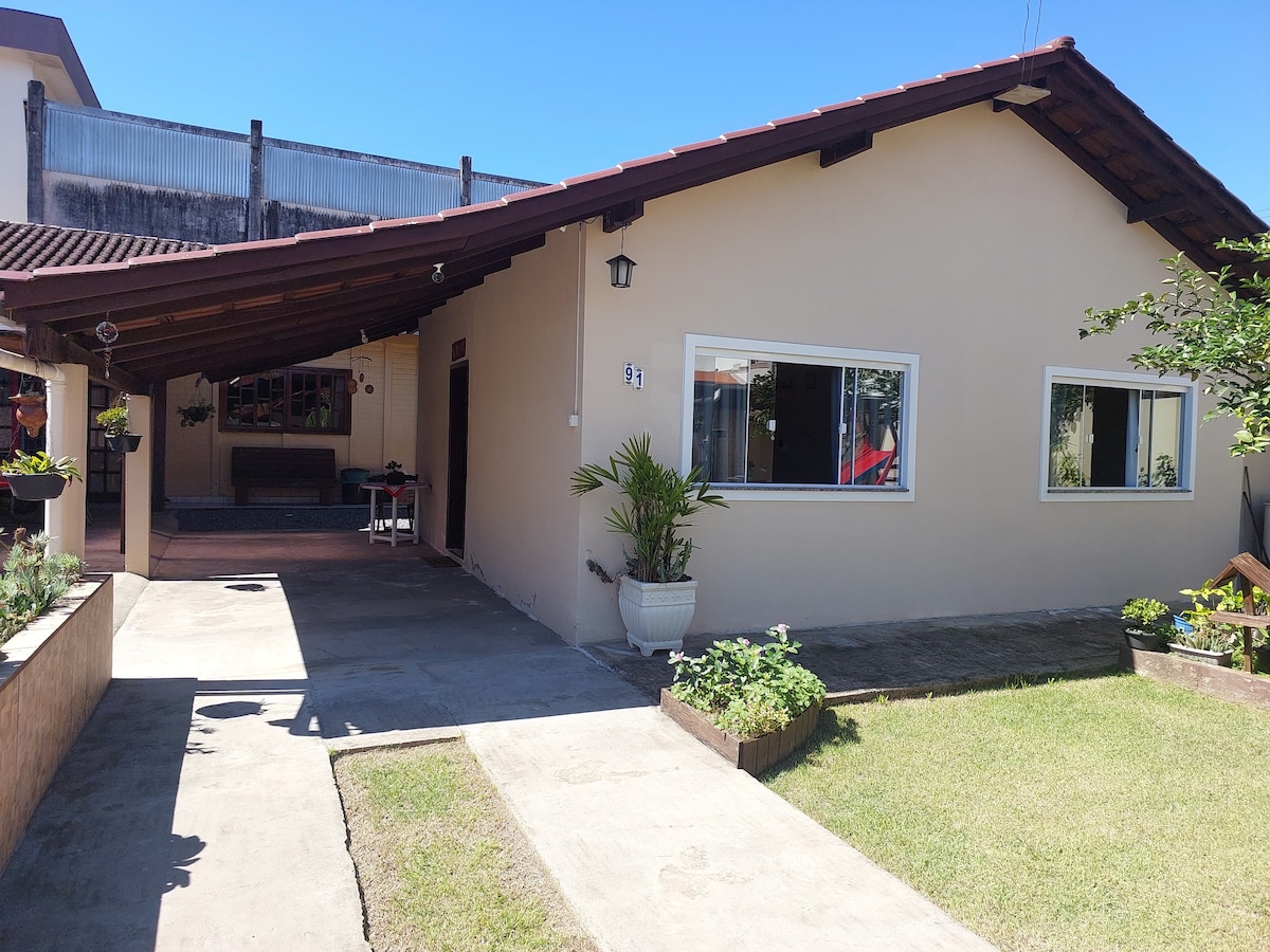 Casa com cozinha completa com utensilios. Sala de estar com sofá cama, quarto com cama de casal e ar condicionado, travesseiros e cobertas. Lavanderia com máquina de lavar e tanque. Banheiro completo com espelho. Fornecemos roupas de cama, toalhas de banho e rosto. Casa cômoda e bem localizada, próxima às empresas WEG e Marisol, a 300m da Via Verde. Com TV led smart 32'' com Netflix. Garagem. Acesso da casa com portão eletrônico e câmeras de segurança. Animais devem ser informados na reserva.