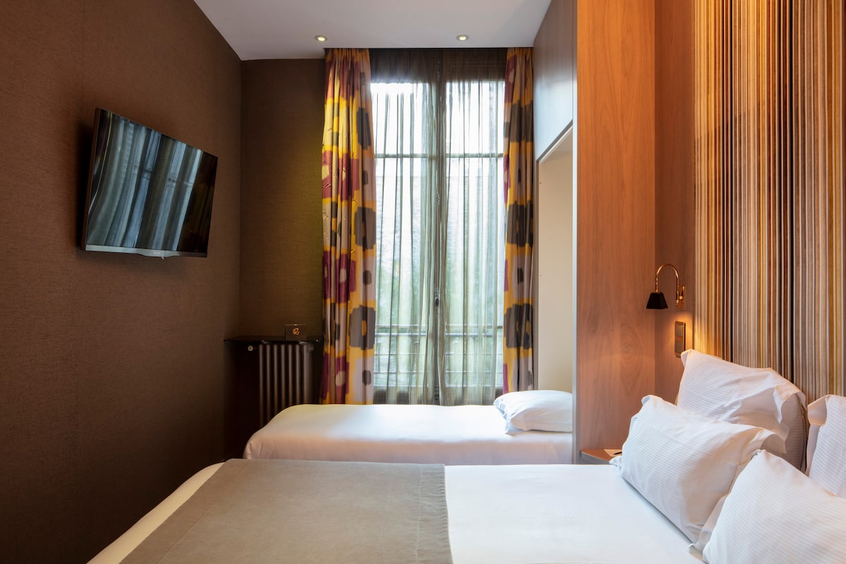 Twin room with private bathroom in the Hotel Palm***, Astotel 3-star boutique hotel ideally located in the heart of the 9th arrondissement of Paris, near Montmartre, Gare de l'Est and Gare du Nord train stations, and public transportation. 24/7 reception. Possibility of free luggage deposit all day on arrival and departure days.