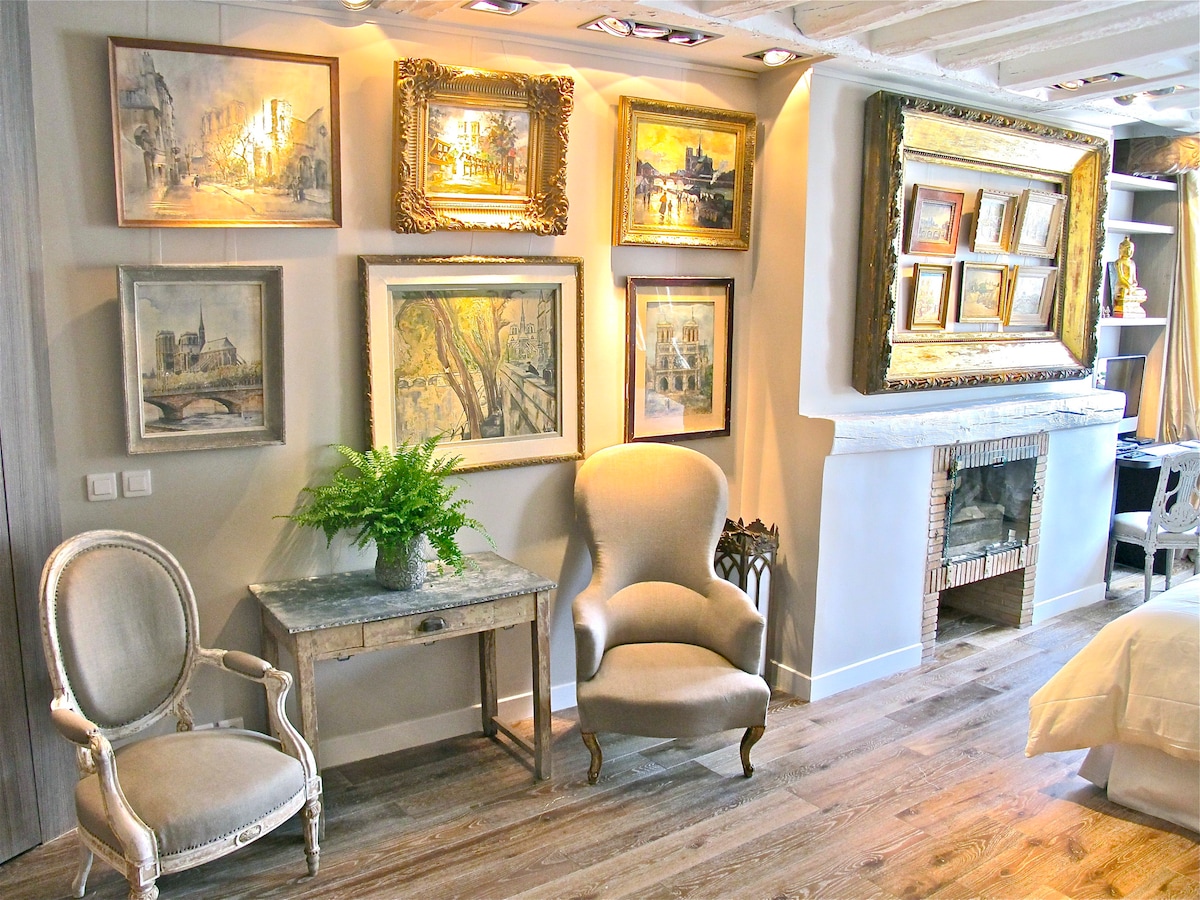 Ótrúleg íbúð sem er algjörlega endurnýjuð og snýr að einni af fornu gotnesku dómkirkjum heims, dýrmætar innréttingar. Mjög sólrík gönguleið á 4. hæð milli Louvre og Pont Neuf, með svefnherbergi (queen-size rúm) , stórri stofu með mjög þægilegum svefnsófa (140x190), fullbúnu eldhúsi, baðherbergi með baðkeri, arni, flötu sjónvarpi og hröðu þráðlausu neti!