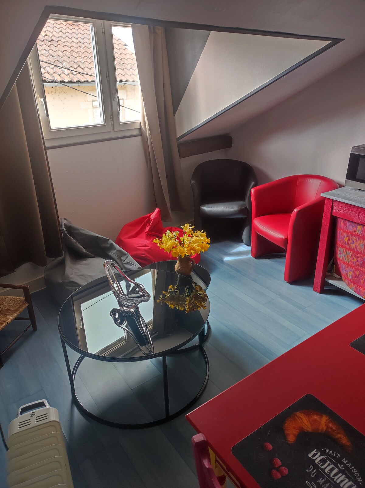 Logement atypique au pied de la cité médiévale dans une rue piétonne très calme ,vue imprenable sur les ruines du château ; parkings gratuits à proximité ,parc municipal , jeux d' enfants , lac .Entrée privée sur une terrasse de détente accédant au logement privé composé d' un grand salon , deux chambres , salle de bain avec WC . WIFI gratuite , télévision écran plat, frigo ,micro ondes , cafetière ,bouilloire , grill pain ,plaque induction ,vaisselle ,lit parapluie ,ventilateur, sèche cheveux