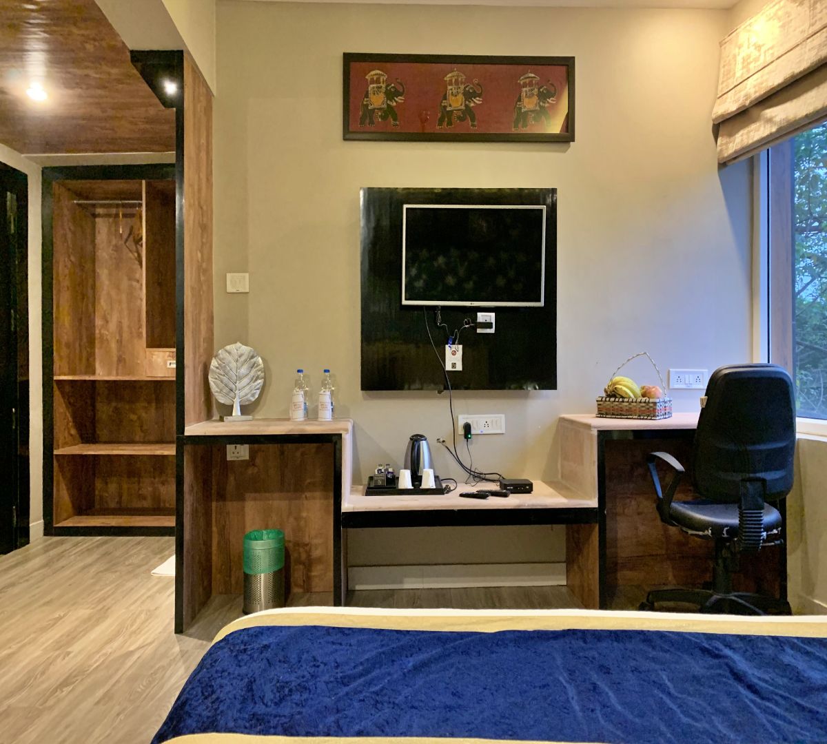 Upplifðu óviðjafnanlegan lúxus í The Luxe Villa by Vaaranya Group með Super Deluxe Room - ímynd þæginda og glæsileika. Þetta rúmgóða afdrep, með einkasvölum, býður upp á nútímaleg þægindi á borð við stórt baðherbergi með sérbaðherbergi, háhraða þráðlaust net, flatskjásjónvarp, úrvalssnyrtivörur og fleira. Njóttu fullkominnar blöndu af fágun og þægindum, allt á ótrúlegu verði. Lúxusathvarfið þitt bíður!