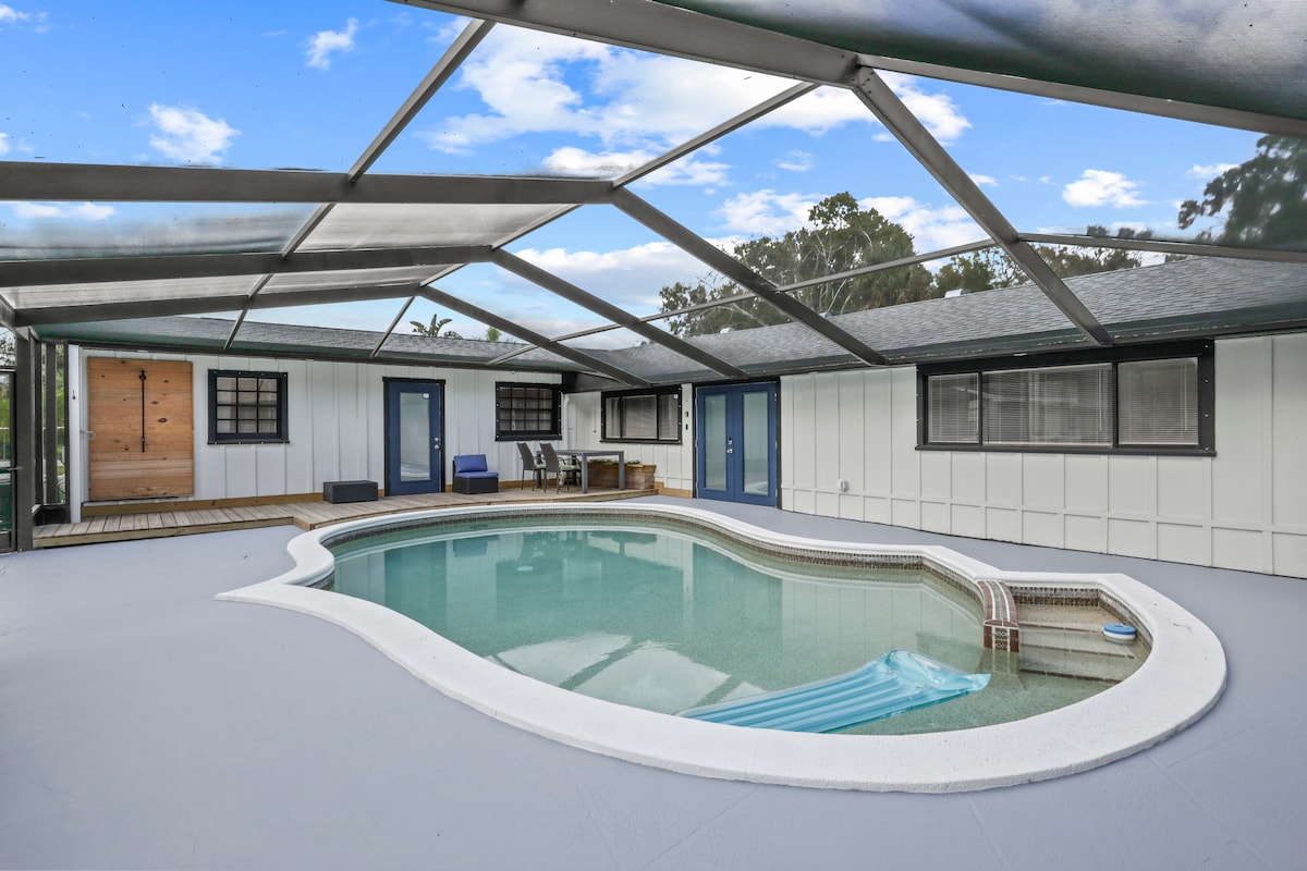 Gaman að fá þig í fulluppgert afdrep okkar við „Coastal x Boho“. Við höfum tekið þetta rými saman með lúxus áferðum og mjúkum rúmfötum. Full afslöppun bíður þín miðsvæðis á eftirsóttum áfangastað Vero Beach FL þegar þú situr í kringum upphitaða saltvatnssundlaugina og bláa jays frolicking í kringum einkabakgarðinn. Næsta strönd er í 10 mínútna fjarlægð. Upplifðu tærar bláar öldur og framandi dýralíf frá sæskjaldbökum, höfrungum og mannætum.