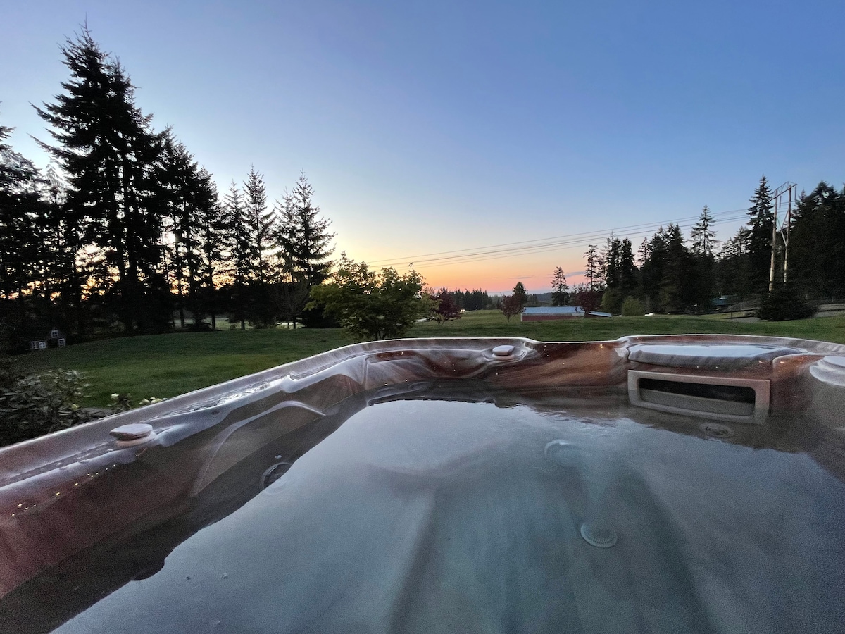 Gaman að fá þig í þitt fullkomna einkaafdrep í PNW. Notalega þriggja herbergja A-rammahúsið okkar bíður innan um trén með sveitalegum sjarma. Sötraðu morgunkaffið á meðan þú hlustar á fuglasöng og leyfir stressinu að bráðna. Þegar kvölda tekur skaltu renna þér í heita pottinn. Það er hrein sæla með útsýni yfir Hood Canal. Sólarupprás og sólsetur mála himininn í litum gulls og indígó og skapa dáleiðandi striga sem breytist með hverju augnabliki.