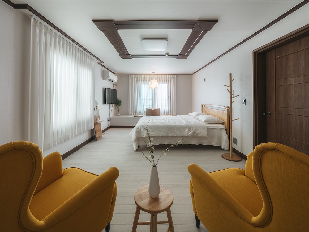 Halló. Við viljum skapa rými þar sem þú getur gleymt pirringi borgarinnar með því að snerta hafið með öldunum sem vinur þinn. Rýmið okkar, sem er í 20 mínútna fjarlægð frá flugvellinum, getur séð Jeju-hafið fyrir framan þig. Space Samsetning 12 pyeong pláss á 3. hæð (með lyftu) 1. Svefnherbergisrými: Herbergið er eins herbergis rými með eldunaraðstöðu. Rúm, vegg-ríðandi sjónvarp, te borð og borðstofuborð fyrir tvo, hanger, standa, vaskur, loft hárnæring, lítill ísskápur (aðskilin frystir), örvun 2. Eldhús: Borðbúnaður og eldhúsáhöld fyrir 2 manns 3. Baðherbergi: Sturta með sólblómum, handklæði, hárþvottalögur, hárnæring, líkamssápa, salernispappír (Athugaðu að ekki er hægt að bjóða tannbursta vegna laga um hollustuhætti). 4. Verönd 5. Grillsvæði Hafgrill tengt sjónum: 20.000 unnar krónur (kol og grill í boði).) Sérstakt grillsvæði er við hliðina á anddyrinu, miðað við rigningarveður. 6. Bílastæði: Rafmagns bílastæði er í boði. 7. Vinsamlegast óskaðu eftir þvottahúsi og þurrkara sérstaklega við innganginn á fyrstu hæð. Þakka þér fyrir.
