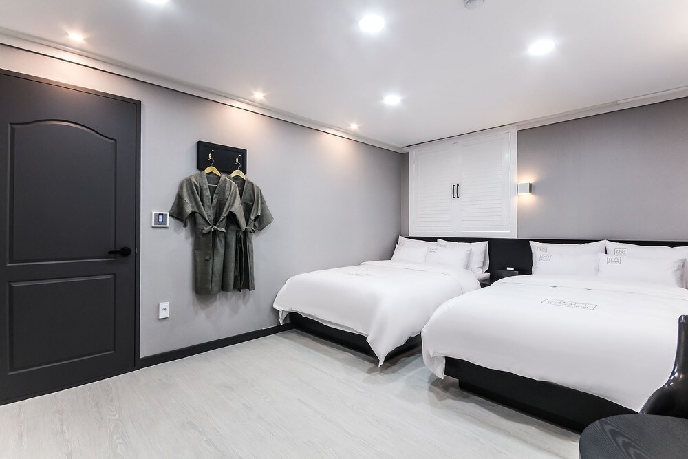 Þetta er 50 pyeong þakíbúð. Þetta er snyrtilegt rými sem samanstendur af 3 herbergjum, rúmgóðri stofu og 2 baðherbergjum og er vel búið grunnþægindum. • Búin herðatrjám og loftræstingu sem veitir notalegt umhverfi. • Þvottavél er til staðar og þar er einnig eldhús. Það er örbylgjuofn. Þar er kaffikanna og vatnshreinsir. Það er erfitt að elda (þetta er hótel) • Þú getur haft það notalegt með kælingu á sumrin og kyndingu í katli á veturna. • Sjónvarp og net (WiFi) eru uppsett svo að þú getir notið frítímans þegar þér hentar. Þetta er hópherbergi sem rúmar að hámarki 16 manns eða fleiri.