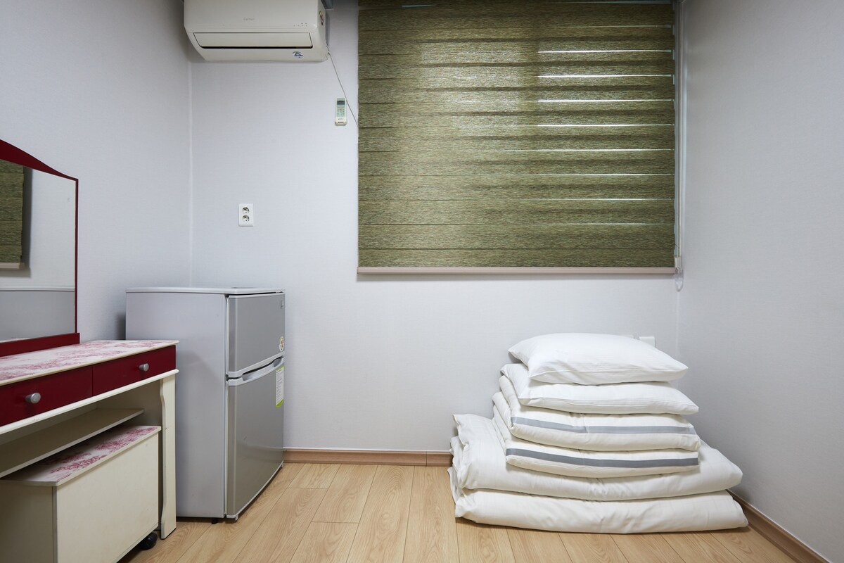 Halló, við erum Onda, að rannsaka og bjóða upp á fjölbreytt hvíldarsvæði. Við vonum að allir sem gista hér eigi notalega og ánægjulega stund. [Kynning á gistiaðstöðu] Þetta er snyrtileg og rúmgóð eign í Yeosu. Búðu þig undir heilunarferð með ástvinum þínum, ástvinum og vinum. [Tegund herbergis] Tegund eins herbergis (1 hjónarúm, 1 einbreitt) + salerni * Við bjóðum upp á grunnrúmföt fyrir fjóra en ef þú vilt nota aukarúmföt verður þú að greiða 20.000 won fyrir eitt sett á mann á staðnum.