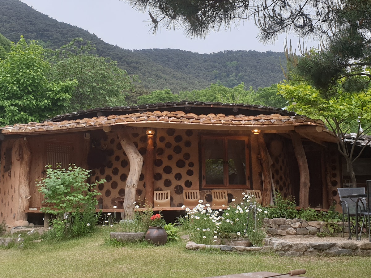 Jirisan Dulle-gil er þriggja rétta moldhús byggt í laginu eins og sveppir sem eru aðeins byggðir úr óhreinindum og viði í 540 hæð. Herbergið er upphitað af Agung. Stofan er ketill. Það er moldarhús og garður í garði sjálfstætt. Það er grillaðstaða í garðinum og það er lífrænt grænmeti og villt grænmeti í garðinum svo að þú getur borðað það strax. Það er mjög langt frá þorpinu, svo það er rólegt og notalegt í furuskóginum. Aðeins þeir sem njóta náttúrunnar í rólegheitum geta komið. Þú getur komið með gæludýrið þitt.