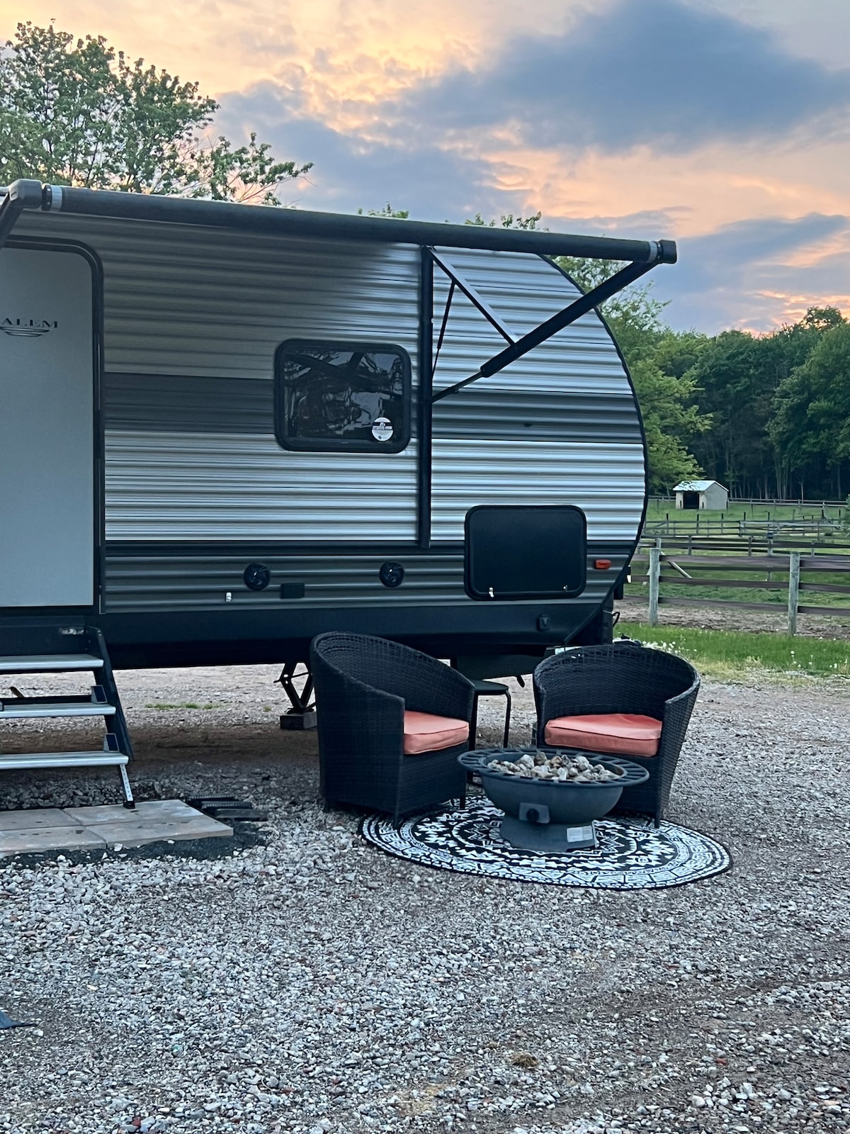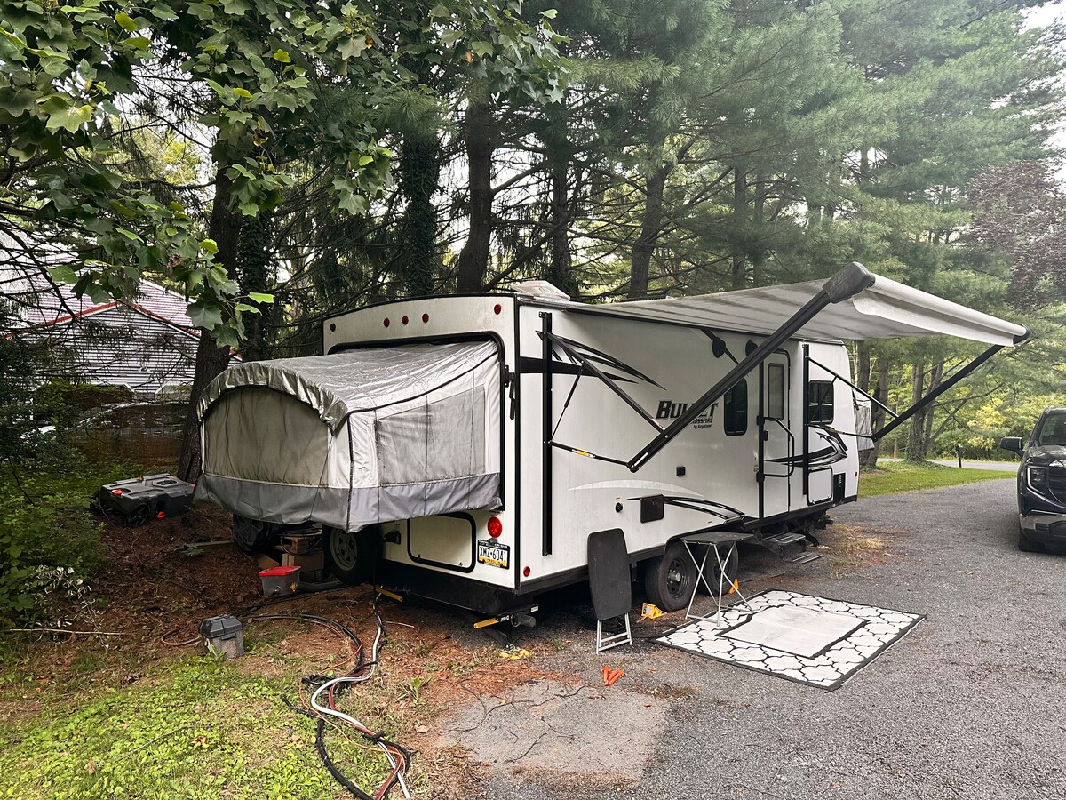 The Rusty Goat (our 2021 Keystone Bullet Crossfire Hybrid RV) is parked on our property (Deer Hive Acre) in Solebury Township, PA. Við erum staðsett á einum hektara við rólega götu þar sem dádýrin heimsækja okkur næstum daglega. Þú gætir einnig komið auga á rauðan halaref meðan á dvöl þinni stendur. Þú getur slakað á og notið útilegu nálægt einum af bestu smábæjum PA, New Hope, PA. Fullbúið! (Rafmagn, vatn, fráveita). Útsýni yfir friðsæla, opna grasið umkringd stórum trjám. Nóg að skoða í nágrenninu.