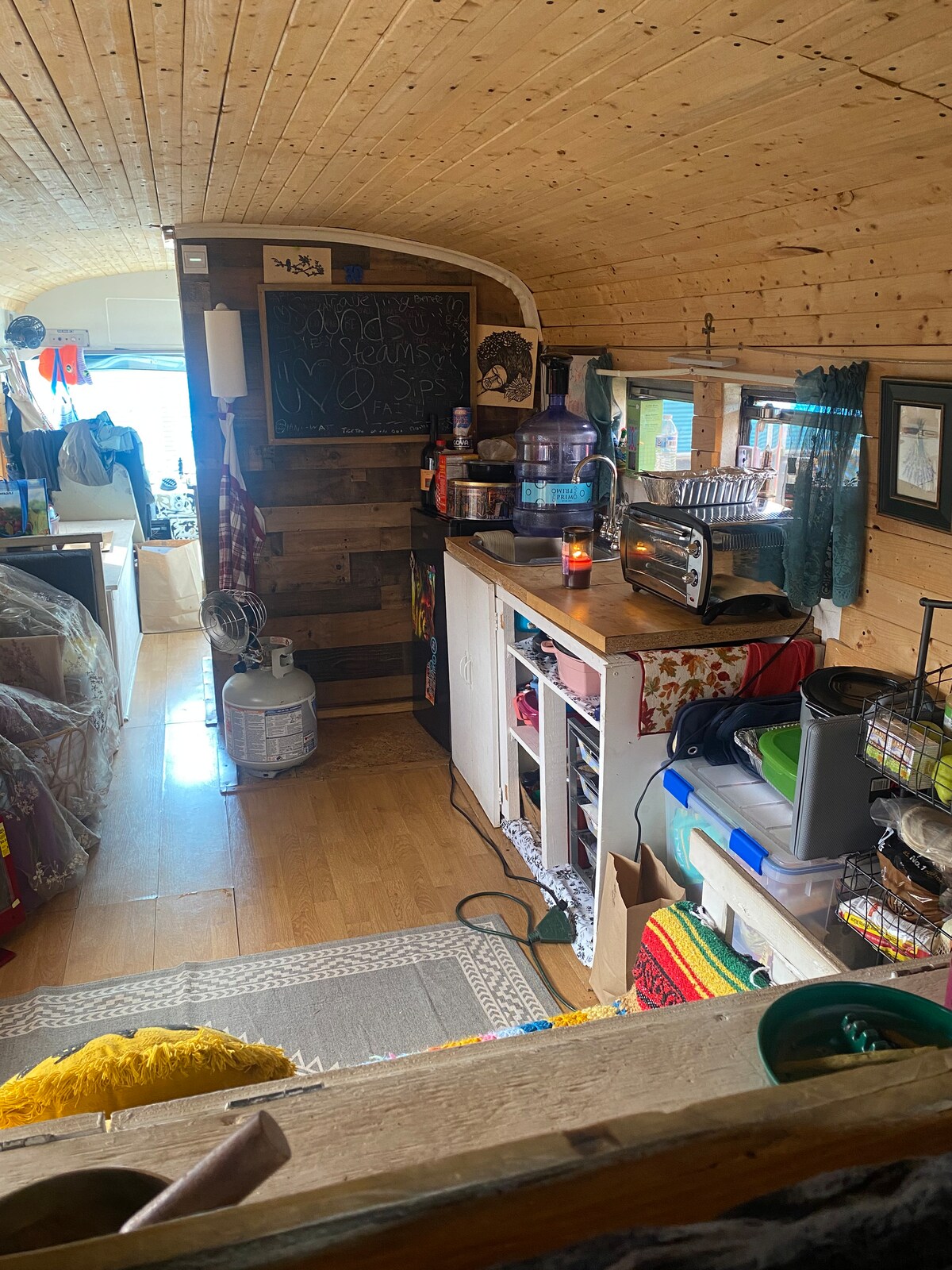 Njóttu kyrrðarinnar og friðsældarinnar utan alfaraleiðar. Smáhýsi byggt af ást og gert viljandi fyrir lækningu og hugleiðslu. Þú munt njóta hvíldar í þessari Blue Bird skólarútu frá 1988 sem var breytt í pínulitla vistarveru. Sólarafl og 2 EcoFlow Delta Max 2000 sólarrafalar innifaldir. 2 800 Watt sólarplötur á þaki og færanlegt 160W spjald fylgir. Vatnsdælur, lífbrjótanlegir salernispokar, 2ja brennara rafmagnseldavél, teketill, brauðristarofn, loftræsting, própanhitari.