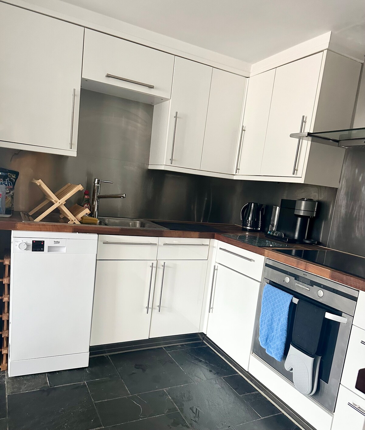 Við fórum nýlega á eftirlaun og erum með íbúð með einu svefnherbergi í húsinu okkar sem er með aðskilið aðgengi upp stiga fyrir utan. Í svefnherberginu er mjög stórt rúm sem er hægt að setja saman úr tvíbreiðum rúmum, snyrtiborði sem er byggt inn í fataskápa og skápapláss. Á baðherberginu er sturta, vaskur og salerni. Eldhúsið er í opinni setustofu með borðstofuborði og sjónvarpi. Það er Nespressokaffivél. Gestir hafa aðgang að gasgrilli og setusvæði fyrir utan.