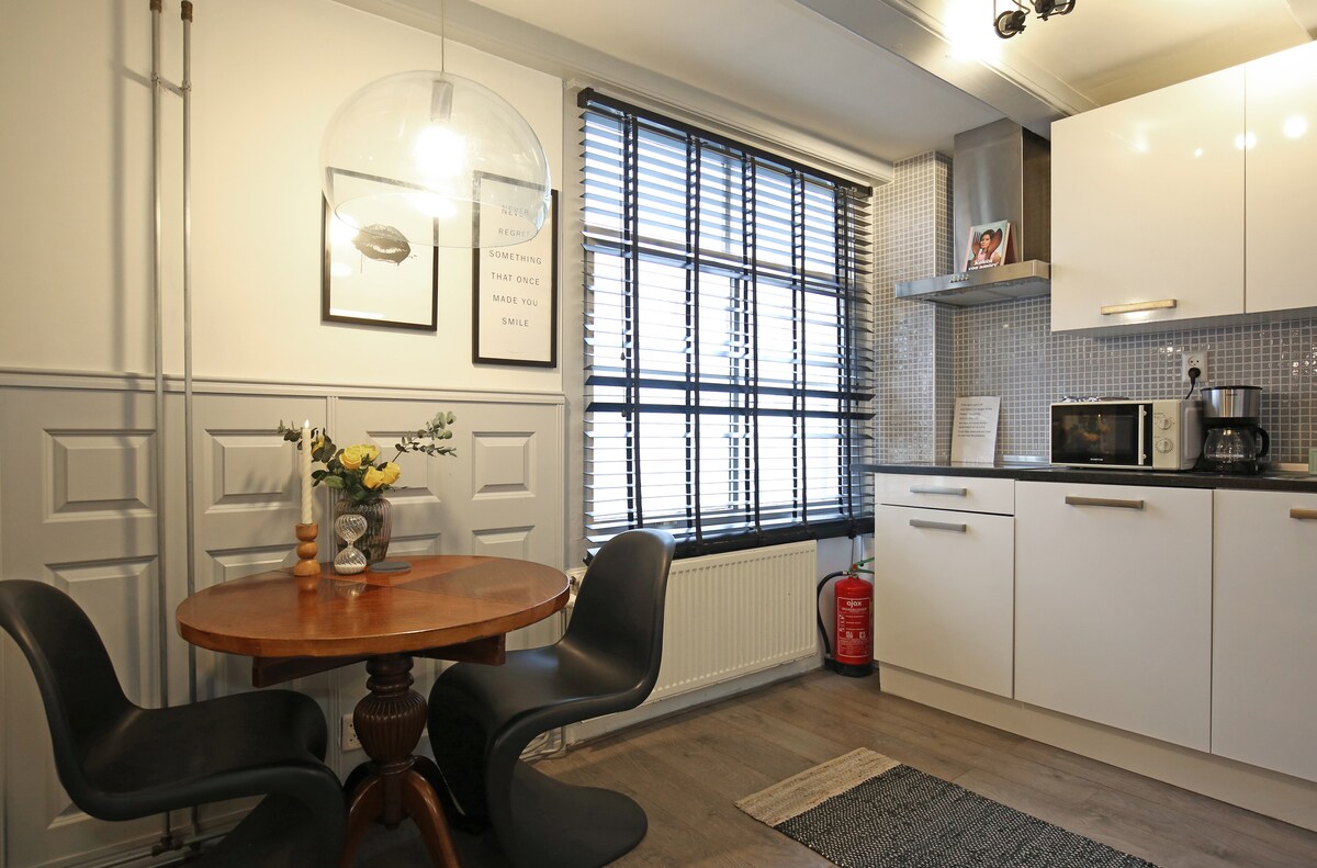 Heillandi hús frá 17. öld við sögulegu Geldersekade, í hjarta Amsterdam. Þessi fallega enduruppgerða gistiaðstaða býður upp á tvö rúmgóð herbergi með king-size rúmum, endurnýjað baðherbergi með sturtu og hlýlegan borðstofuborð með notalegum sófa. Í búri er ísskápur, ketill, kaffivél og nauðsynjar. Skrefum frá Nieuwmarkt, aðalstöðinni, síkjum, kaffihúsum og söfnum. Fullkomið fyrir allt að fjóra gesti — tilvalið fyrir pör, vini eða fjölskyldur.