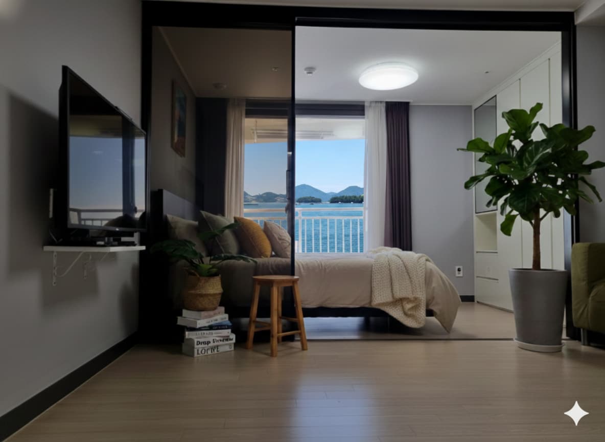 Þetta er ný bygging með sjávarútsýni með útsýni yfir Dolsan-brúna svo að hún er rúmgóð og hrein.🌊🩵 Það er mjög nálægt helstu áhugaverðu stöðunum og þetta er frábær staður fyrir vini og elskendur eða fjölskyldur 2-4 manna til að gista saman. Þetta er tvískipt bygging með stofu, eldhúsi, baðherbergi og svefnherbergi á fyrstu hæð (aðskilið rými frá stofu, queen-rúmi) og á annarri hæð er dýna sem rúmar tvo einstaklinga vel. Þú getur notið Yeosu næturútsýnisins og næturútsýnisins með útsýni yfir sólarupprásina að morgni og sjóinn fyrir framan Namhae frá öllum rýmum. Á annarri hæð er einnig hitavír svo að þú þarft ekki að hafa áhyggjur af kulda á veturna. Á sumrin er loftræsting kerfisins uppsett svo að þú getir kælt þig niður og notið frísins. (1 stofa, 1 svefnherbergi, 2 samtals) Í boði Disney Plus ott Það er staðsett í 1 mínútu akstursfjarlægð frá Yeosu Expo stöðinni. Maritime kláfferjur, Big O Show, Minam Cruise Fireworks Show, Yeosu Romantic Pocha Street, Odongdo Island, Aqua Planet og Marine Park eru í göngufæri. Þú getur einnig búið í Yeosu í mánuð og því biðjum við þig um að hafa samband við okkur. 🏡❣️