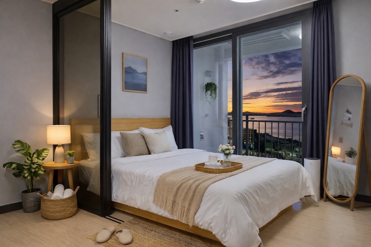 Hallķ. Þetta er hreinn og hljóðlátur hótelstíll íbúa. Þessi eign er staðsett miðsvæðis og býður upp á bæði þægindi og fágaðan stíl. 5 mín. göngufjarlægð ☆ frá sjávarsíðunni ☆ Helstu áhugaverðir staðir eru í innan við 10-15 mínútna akstursfjarlægð Það er ☆ queen-rúm, sjónvarp (Netflix, YouTube) svo að þú getir hvílst vel. Matvöruverslun á ☆ 1. hæð, Ediya Þægileg aðstaða eins og Lotte Mart og veitingastaðir eru í 3 mínútna fjarlægð. Þrifstjórn í 2 klst. til að viðhalda hreinlæti ☆ í gistiaðstöðunni (skipt er um rúmföt daglega) ☆ Ýmsar eldunarvörur, baðherbergisvörur (þar á meðal tannbursti og tannkrem), vatn á flöskum o.s.frv. Ef þú hefur einhverjar spurningar um gistiaðstöðuna skaltu ekki hika við að hafa samband við okkur. * Innritun kl. 15:00/brottför kl. 11:00 Leiðbeiningar ❤️ um áhugaverða staði í nágrenninu á bíl ❤️ 7 mínútur í ✔️Yeosu Fish Market ✔️Artes Museum/Expo/Noctemare/Yi Sunshin Square/Jinnamgwan 8 mínútur ✔️Odongdo/Aqua Planet 9 mínútur ✔️Dolsan Park/Yeosu Marine Cable/Ungcheon Chinsu Park 10 mínútur ✔️Chong-ri Black Sand Beach Railbike 11 mínútur ✔️Ramada Zip Track 12 mín. ✔️Yeosu Art Land 18 mín.