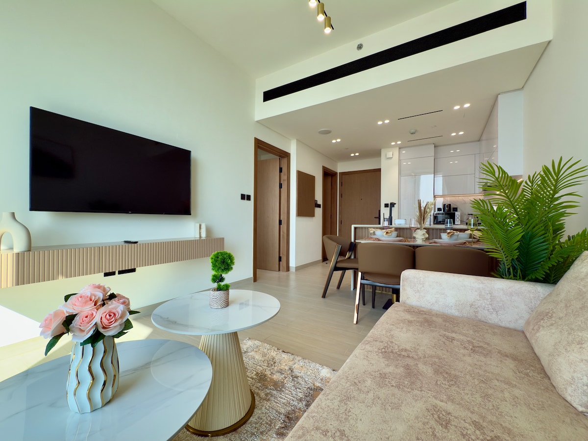 Verið velkomin í bjarta og nútímalega íbúð með 1 svefnherbergi í hjarta Jumeirah Village Circle sem er fullkomin fyrir pör, ferðalanga sem eru einir á ferð, gesti í viðskiptaerindum og jafnvel litlar fjölskyldur. Þetta heimili er vel innréttað og fullt af náttúrulegri birtu og býður upp á allt sem þú þarft fyrir þægilega og afslappandi dvöl. Hvort sem þú ert í heimsókn í nokkra daga eða ert að skipuleggja lengri dvöl mun þér líða eins og heima hjá þér. Slakaðu á og slakaðu á í þessu rólega og stílhreina rými.