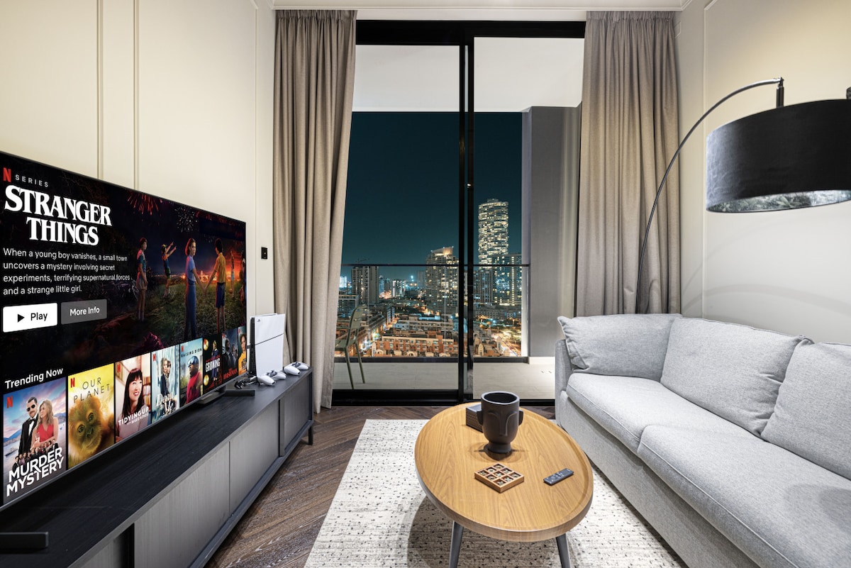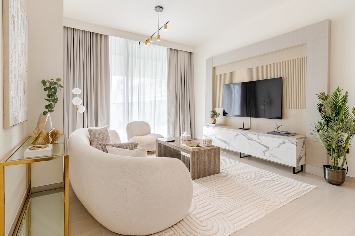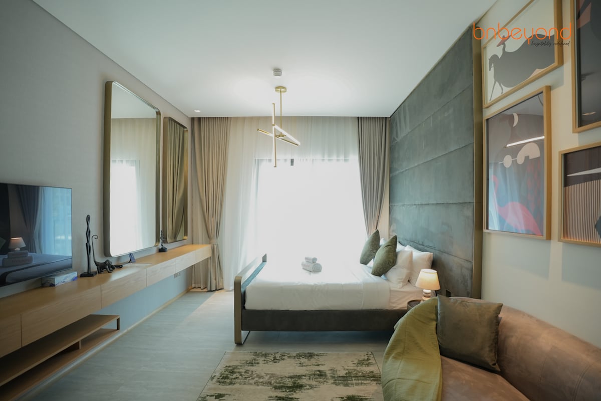 Gistu í glæsilegri íbúð með einu svefnherbergi og útsýni yfir sjóndeildarhringinn í JVC. Fullkomið fyrir pör, ferðalanga sem eru einir á ferð eða viðskiptagistingu. ✓ Einkasvalir með útsýni yfir sjóndeildarhringinn ✓ 1 rúm af king-stærð Aðgangur að ✓ sundlaug og líkamsrækt ✓ Fullbúið eldhús ✓ Háhraða þráðlaust net ✓ Ókeypis bílastæði ✓ Sjálfsinnritun ✓ 7 mín. að FIVE JVC Hotel ✓ Nærri verslun og veitingastöðum Sendu fyrirspurn núna um flutning og afslátt af langtímagistingu!