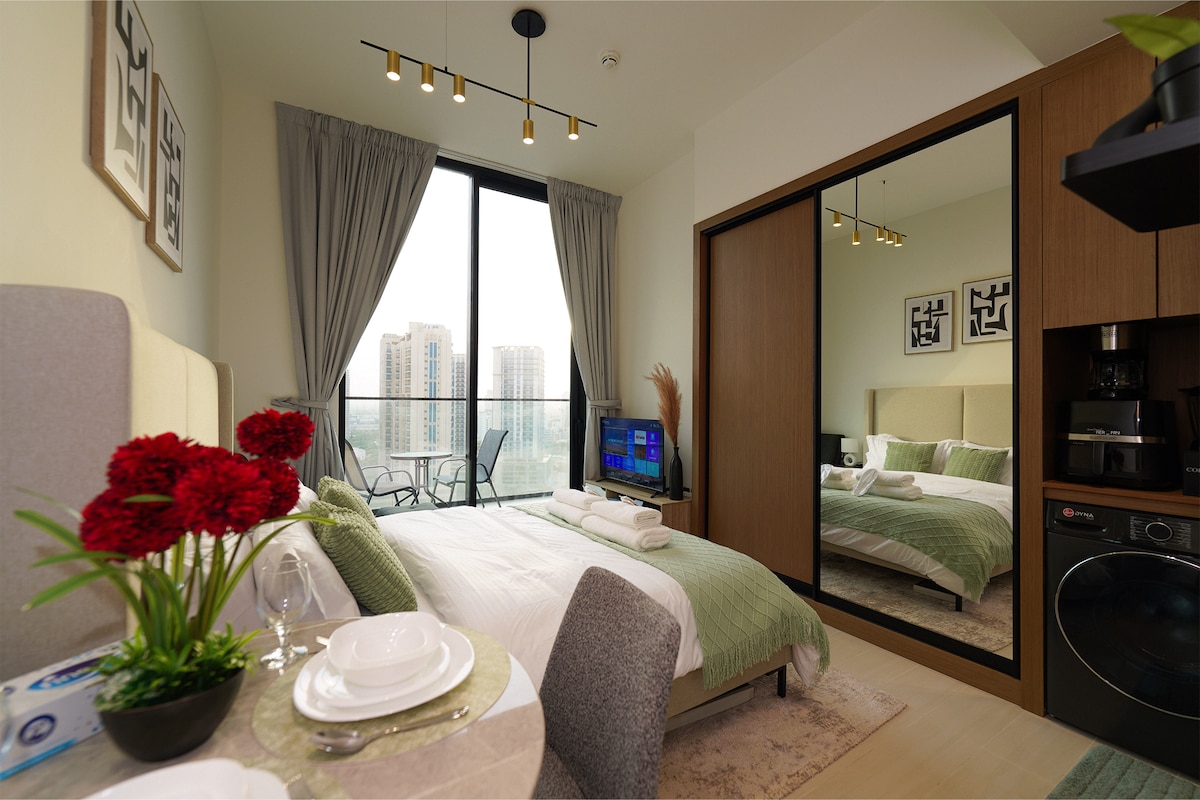 Slakaðu á í þessari friðsælu og glæsilegu stúdíóíbúð sem er staðsett í rólegri byggingu í JVC. Inn í rútu er blanda af við, djúpgrænum tónum og hlýrri LED-lýsingu sem skapar notalega og nútímalega stemningu. Svalirnar eru með útsýni yfir sundlaugina og eru fullkomin til að slaka á. Íbúðin býður upp á líkamsrækt, leiksvæði fyrir börn og ókeypis bílastæði. Stúdíóið er með fullbúið eldhús, þægilegt rúm, svefnsófa og allt sem þarf til að eiga ánægjulega dvöl.