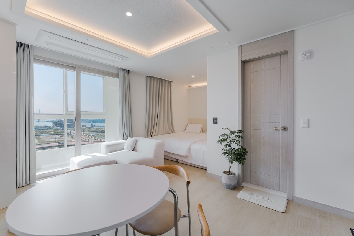 Nýtt opið 28. júlí,✨ 24. ✨Öll herbergi Terrace Ocean View Framúrskarandi Sealy rúm fyrir✨ fullkomna afslöppun Ferskar sérbaunir með kaffi sem er ristað beint á frægu kaffihúsi í✨ Kóreu (sjálfskapað!) Staðsett við ✨hliðina á Songdo Cable Car, nálægt Songdo Beach ❤️Herbergið er úthlutað af handahófi og því skaltu hafa í huga að innan og fjöldi hæða getur verið frábrugðinn myndunum. 📺Raftæki: Sjónvarp með Netflix (með eigin aðgangi), ókeypis þráðlaust net, stök loftræsting, lofthreinsari, veggpúði, ísskápur, Nespresso-kaffivél, hraðsuðuketill, spanhellur 🍳Eldhúsáhöld: nauðsynjar fyrir eldun og borðbúnaður, vínglös, eldhúsþvottaefni og svampur Nauðsynjar fyrir🛁 baðherbergi: sjampó, hárnæring, líkamsþvottur, vatnssápa, handklæði, hárþurrka, hárblásari