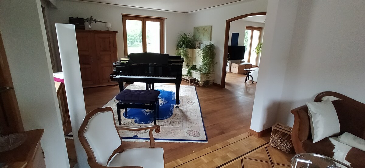 Heillandi húsið okkar á borgarmúr Saint-Ursanne er tilvalið til að slaka á í fallegu umhverfi. Það er á þremur hæðum og býður upp á geymslurými á jarðhæð, stofu með píanói, notalegri stofu og borðstofu með óhindruðu útsýni yfir garðinn og Doubs-ána. Fullbúið eldhús. Á annarri hæð er nýtt, bjart baðherbergi með sturtu og þvottavél ásamt tveimur svefnherbergjum með stórum rúmum og skrifstofu.