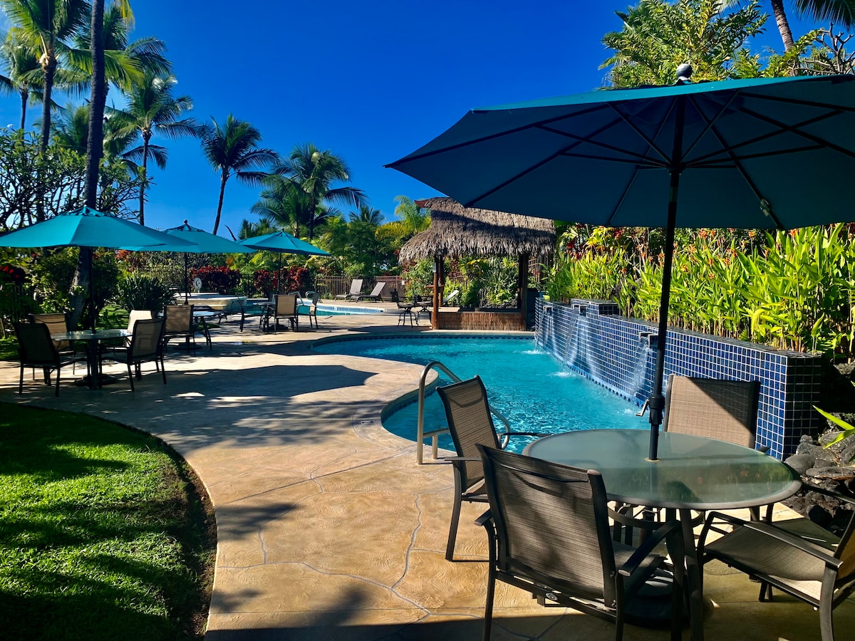 Hoʻomaha a hauʻoli (relax and enjoy) your Hawaii vacation just a short walk from senic Keauhou Bay. Enjoy the bright pink sunsets on your large lanai from either an outdoor dining table or lounge area. Kick your feet back to the sounds of tropical birds and island breezes. Located adjacent to a championship golf course, or utilize our boogie boards and sand toys at the beaches nearby. When you’ve had enough sand between your toes, cool off at the on-site pool.