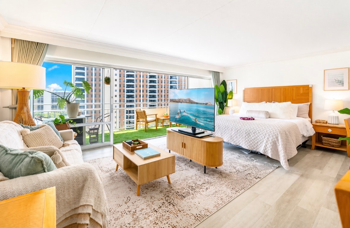 Endurnýjuð íbúð á efstu hæð með 1 svefnherbergi/1 baðherbergi í Waikiki. Fallegt 180 óhindrað útsýni yfir hafið frá svölunum í Júlíu. Sjáðu flugeldana á föstudagskvöldum og sólsetrið frá toppnum! Queen-rúm í svefnherbergi. Á baðherberginu er tvöfaldur vaskur og sturta úr gleri. Fullbúið eldhús. Öryggisgæsla á staðnum allan sólarhringinn. Miðlæg loftræsting, kapall, þráðlaust net fylgir. Bílastæði í bílskúr eru í boði fyrir 35 Bandaríkjadali á dag. Fimm mínútna göngufjarlægð frá Waikiki ströndinni, Hilton hótelinu, Duke lóninu og Ala Moana-verslunarmiðstöðinni