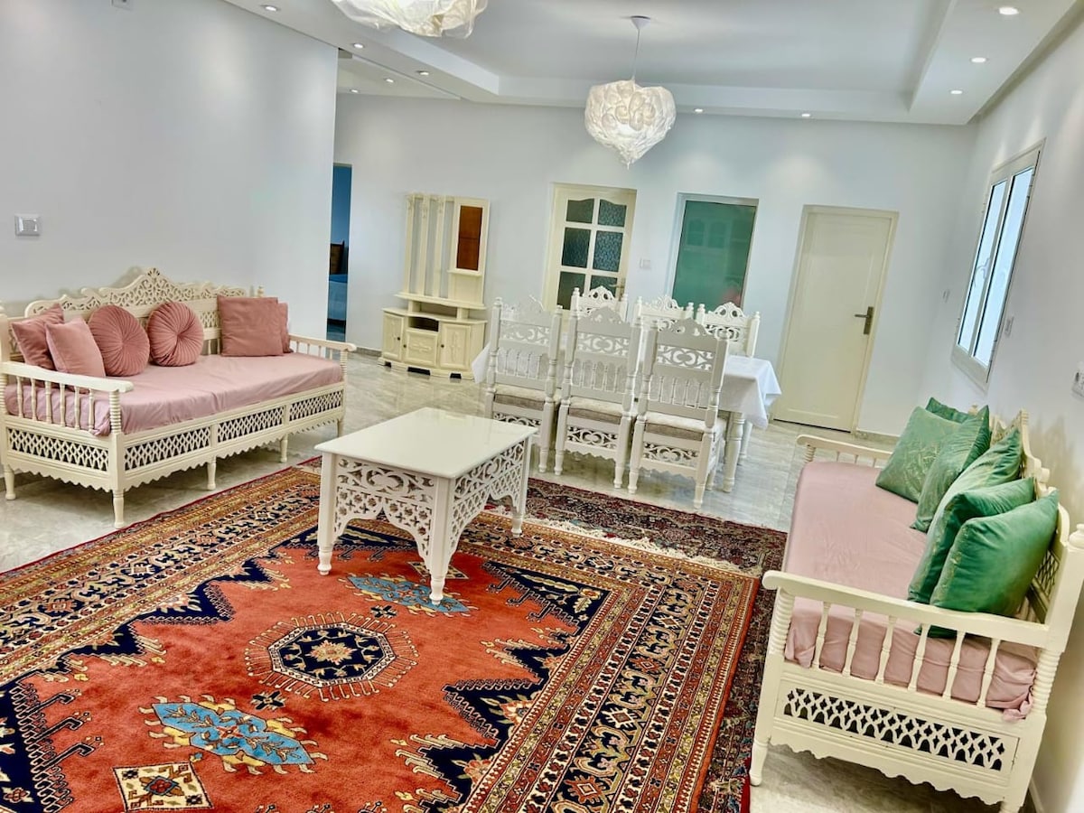 Verið velkomin í nútímalega 3 herbergja íbúðina okkar í hinni helgu borg Kairouan. Íbúðin okkar er hið fullkomna heimili að heiman fyrir fjölskyldur eða hópa sem vilja þægilega og stílhreina dvöl. Staðsetningin er tilvalin til að skoða Kairouan, eina helgustu borg Túnis. Stóra moskan, ein stærsta moskan í Norður-Afríku, er í aðeins 10 mínútna akstursfjarlægð. Medina, sem er á heimsminjaskrá UNESCO, er einnig í nágrenninu og býður upp á innsýn í ríka sögu og menningu Kairouan.